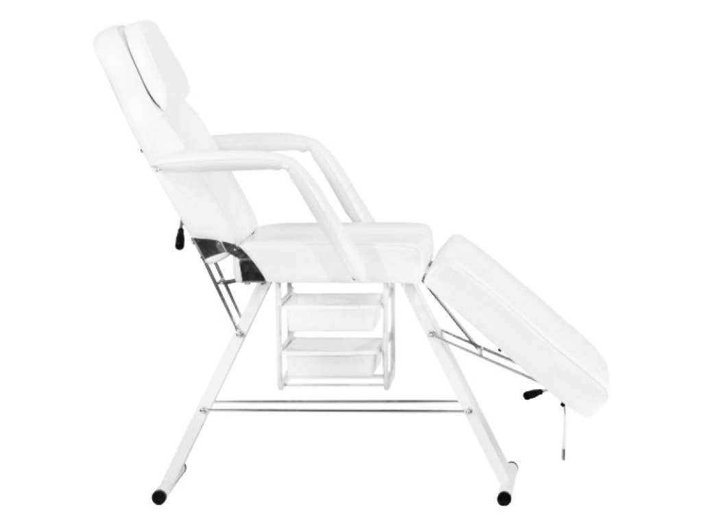 kreslo s otvorom v opierke hlavy, s praktickými odpadovými nádobami, je ideálne na kozmetiku, líčenie a masáže. má odnímateľné podrúčky a zástrčku v opierke hlavy. Ľahko umývateľný poťah sedadla, vyrobený z ekokože, spĺňajúci prísne požiadavky EÚ, estetické, poniklované kovové prvky. Na opierke chrbta je mašľa na jednorazové prestieradlo, obrusy alebo uterák. Kreslo je k dispozícii v bielej farbe. Kreslo sa skladá z: