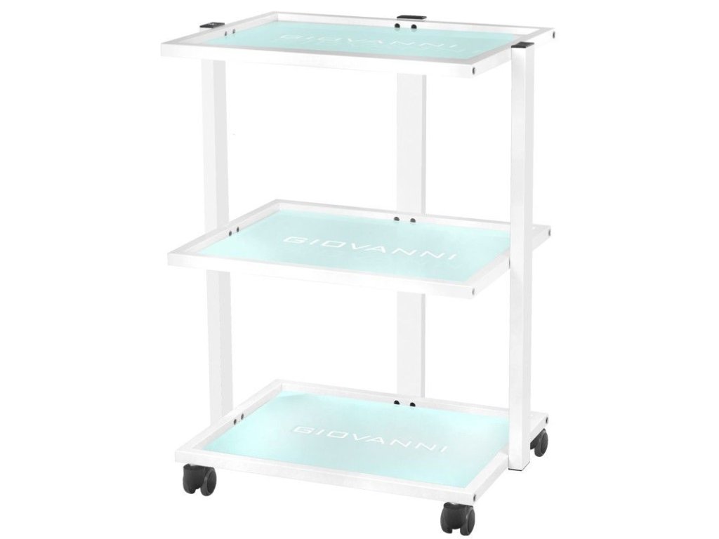 estetický stolík na kozmetické pomôcky, vyrobený z kovu a skla, s pogumovanými kolieskami. má tri sklenené police s vygravírovaným logom giovanni. je možné k nemu pripojiť zväčšovaciu lampu.