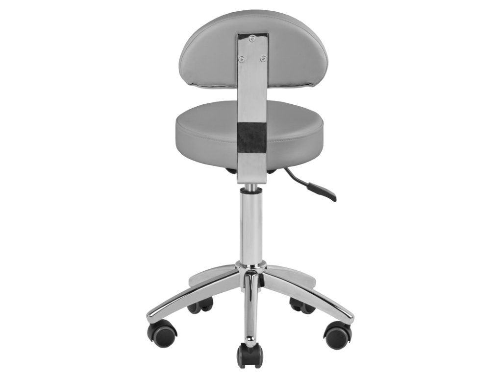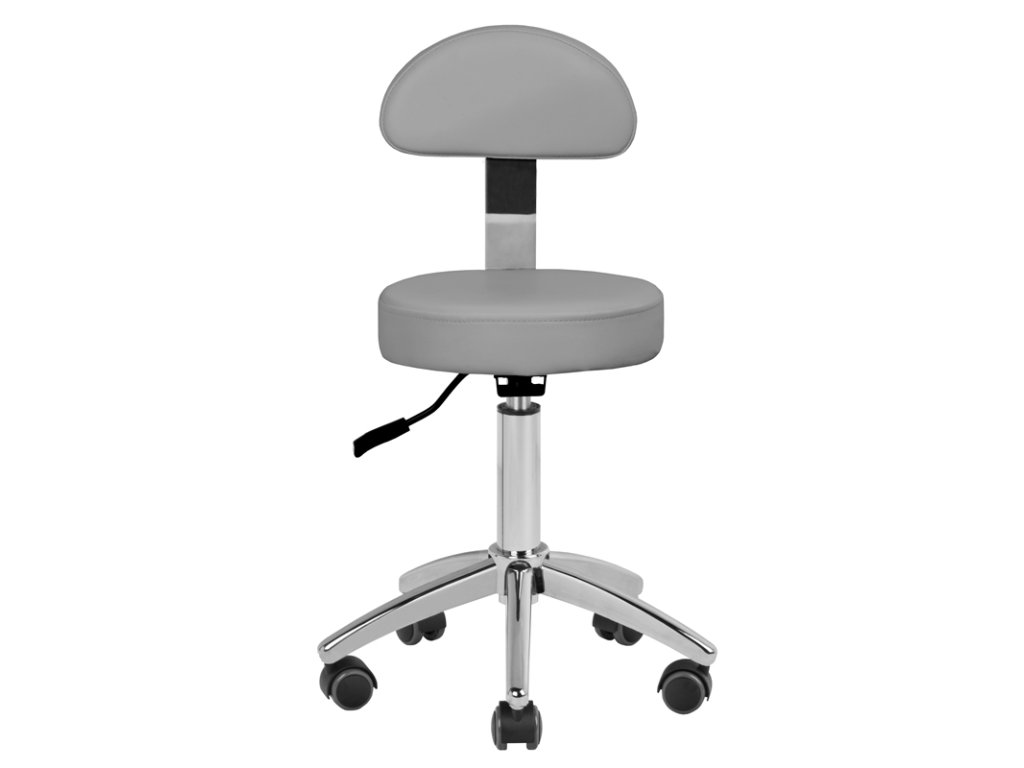 pohodlná kozmetická stolička, stabilná na päťhviezdičkovej základni, s pogumovanými kolieskami, s odnímateľným operadlom, biela, potrebný kus nábytku v kozmetickom salóne.