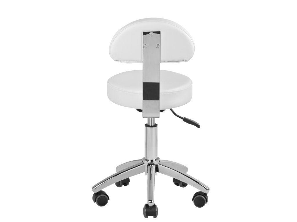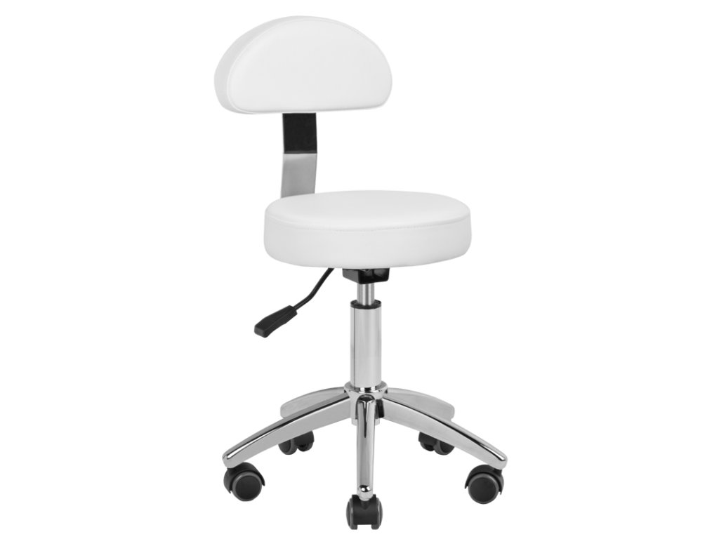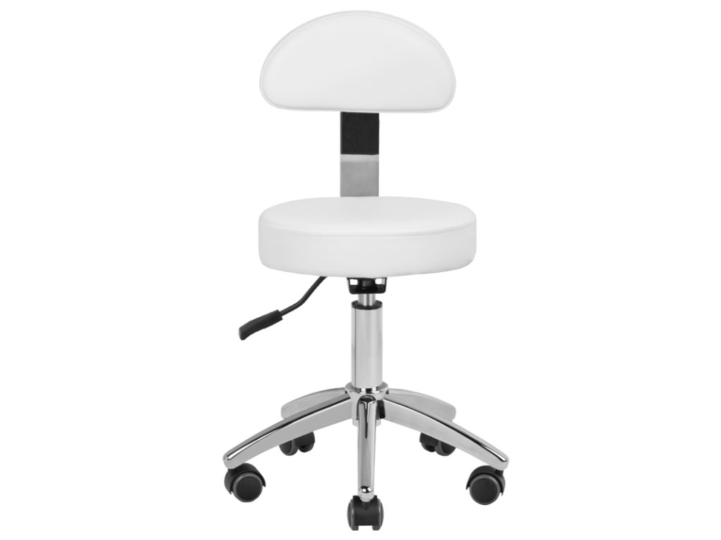pohodlná kozmetická stolička, stabilná na päťhviezdičkovej základni, s pogumovanými kolieskami, odnímateľné operadlo, biela farba, nevyhnutný kus nábytku v kozmetickom salóne.