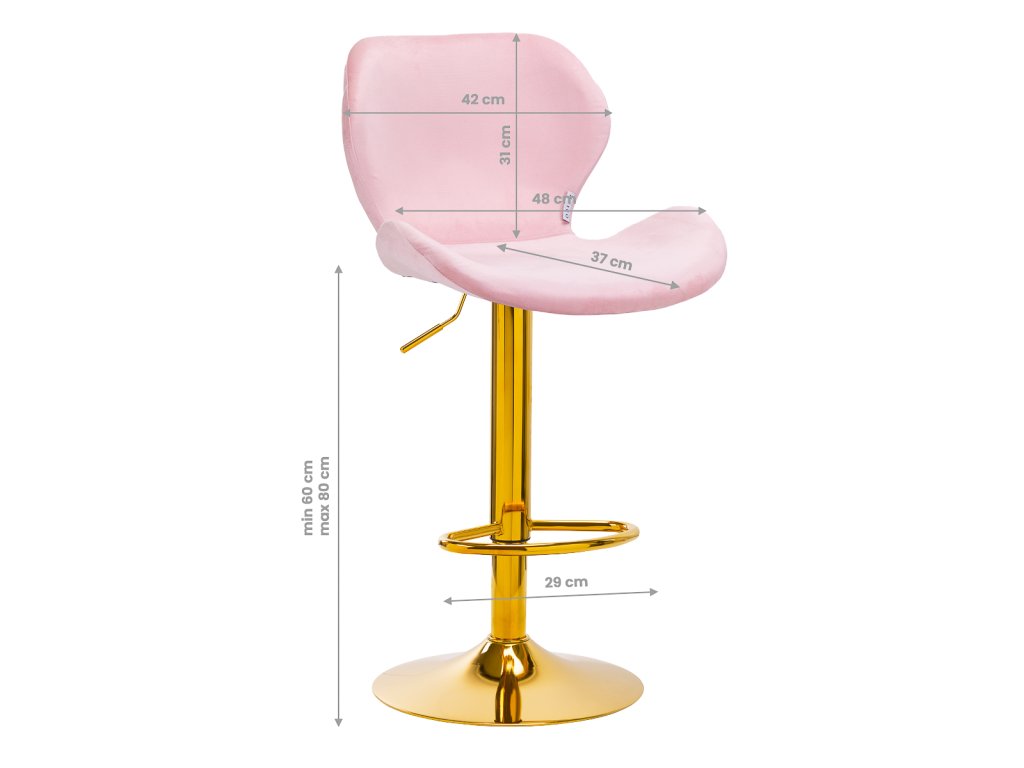 Hocker sa vyznačuje tým, žena dotyk príjemné zamatové čalúnenie v ružových odtieňoch, ktoré mu dodávajú exkluzívny charakter. Stránkaokrúhla základňa s protišmykovou gumou zabezpečuje stabilitu, zatiaľ čominimalistický dizajn umožňuje dokonale zapadnúť do každého interiéru. Zlatý podstavec dodáva eleganciu a harmonicky ladí so zamatovým materiálom. Vďakaergonomický tvar sedadla a operadla a nastaviteľnou výškou je táto stolička ideálnou voľbou pre tých, ktorí oceňujú štýl a pohodlie.