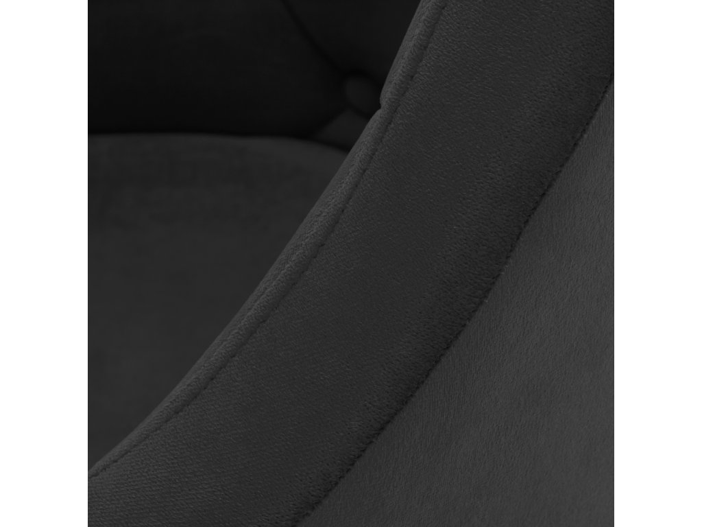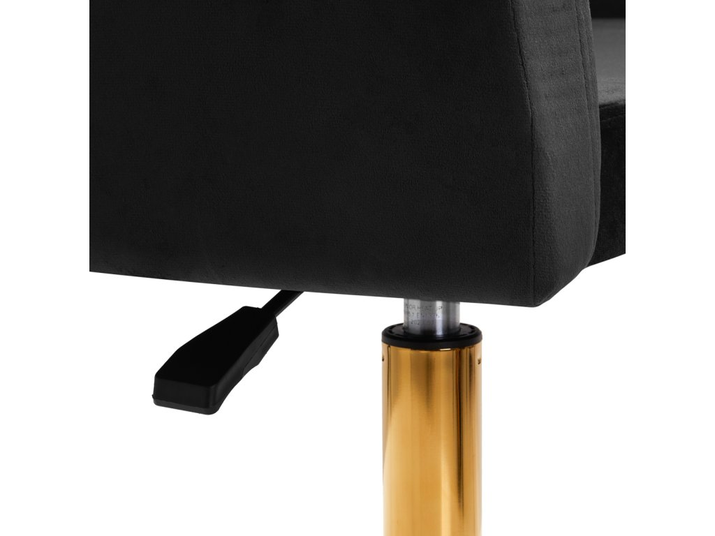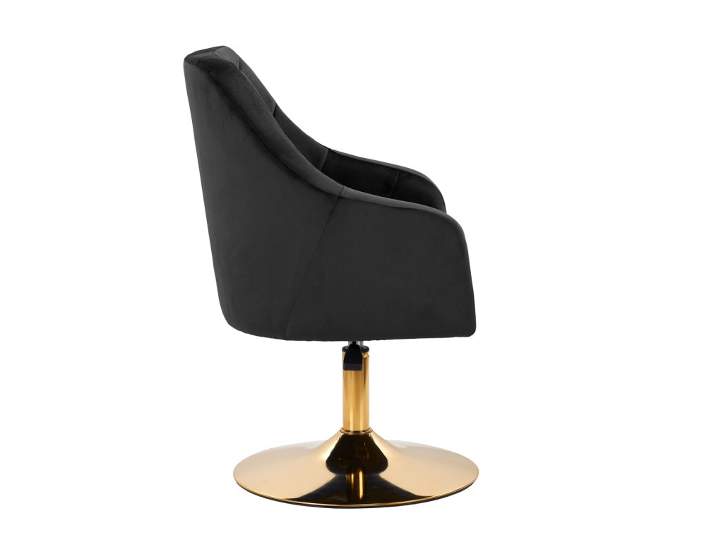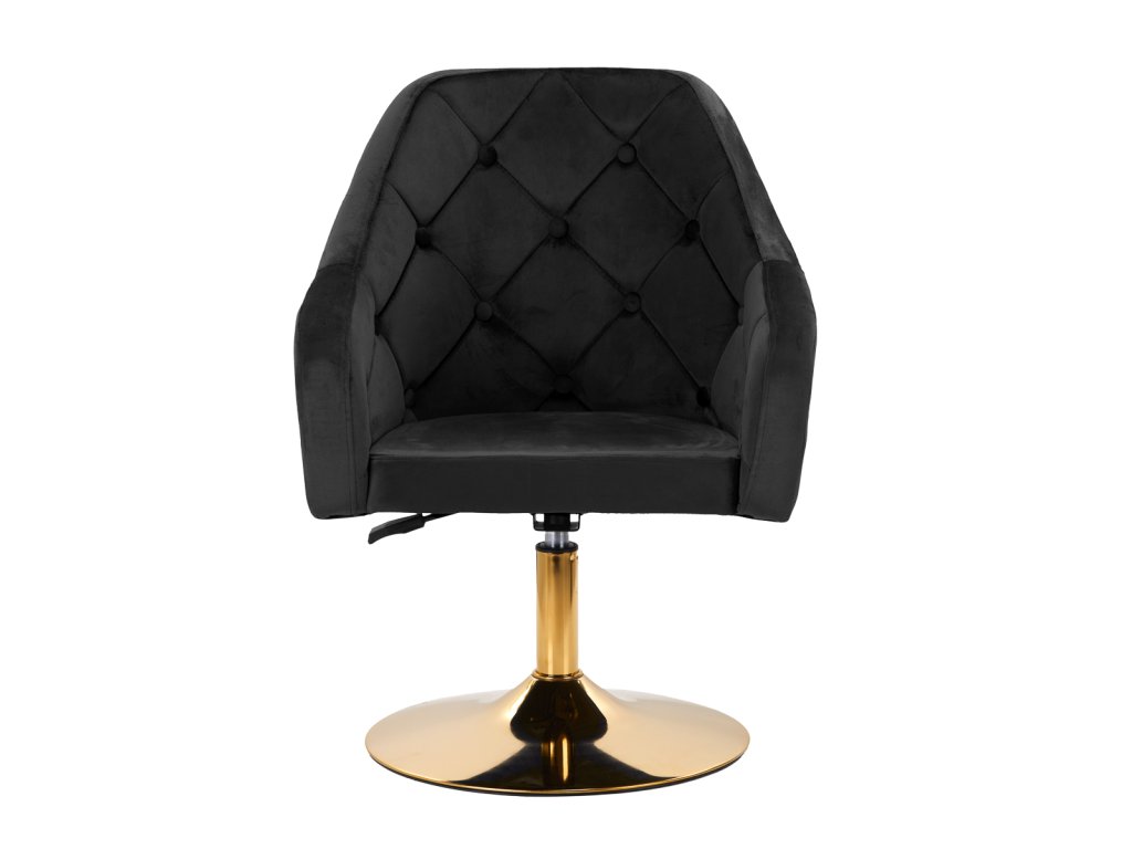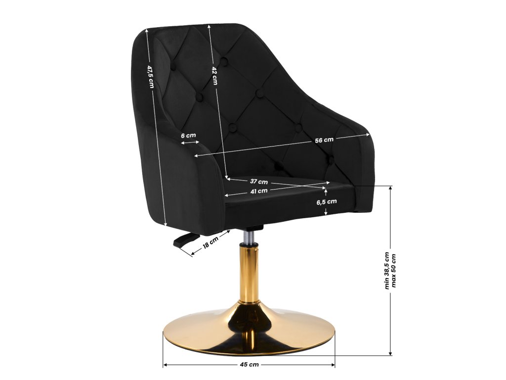 Zaujímavý dizajn dodáva stoličke jedinečný charakter. Na dotyk príjemné zamatové čalúnenie v odtieňoch čiernej adekoratívne prešívanie sa stane ozdobou každého interiéru.Stabilná, okrúhla základňa v zlatých odtieňoch dodáva eleganciu a dokonale ladí so zamatom.Estetika spracovania, pohodlne umiestnené podrúčky, ergonomicky profilované operadlo a estetické prešívanie robia kreslospĺňať požiadavky aj tých najnáročnejších používateľov.