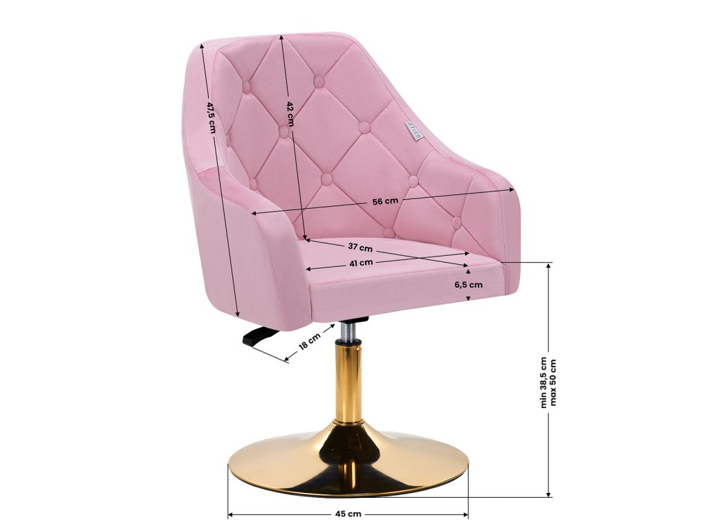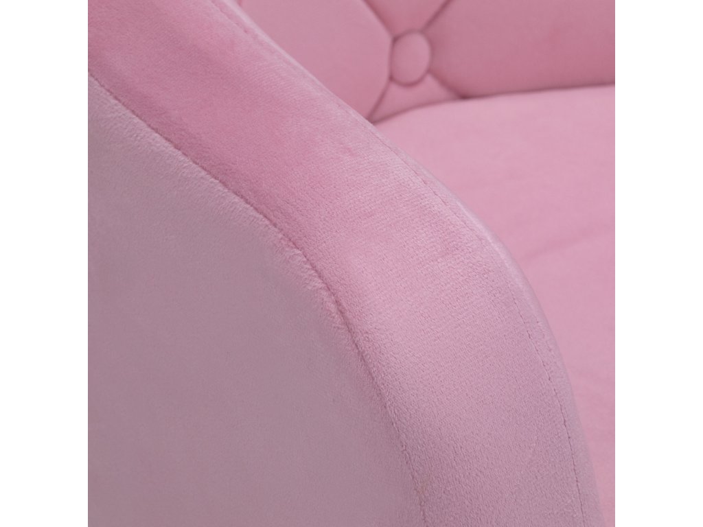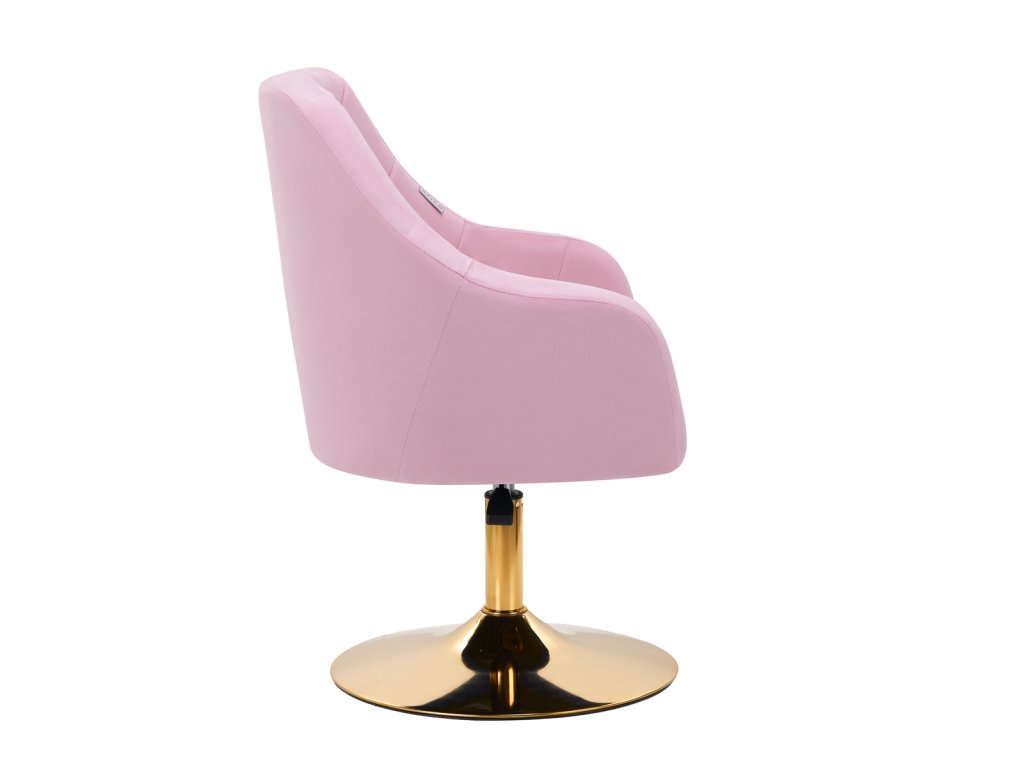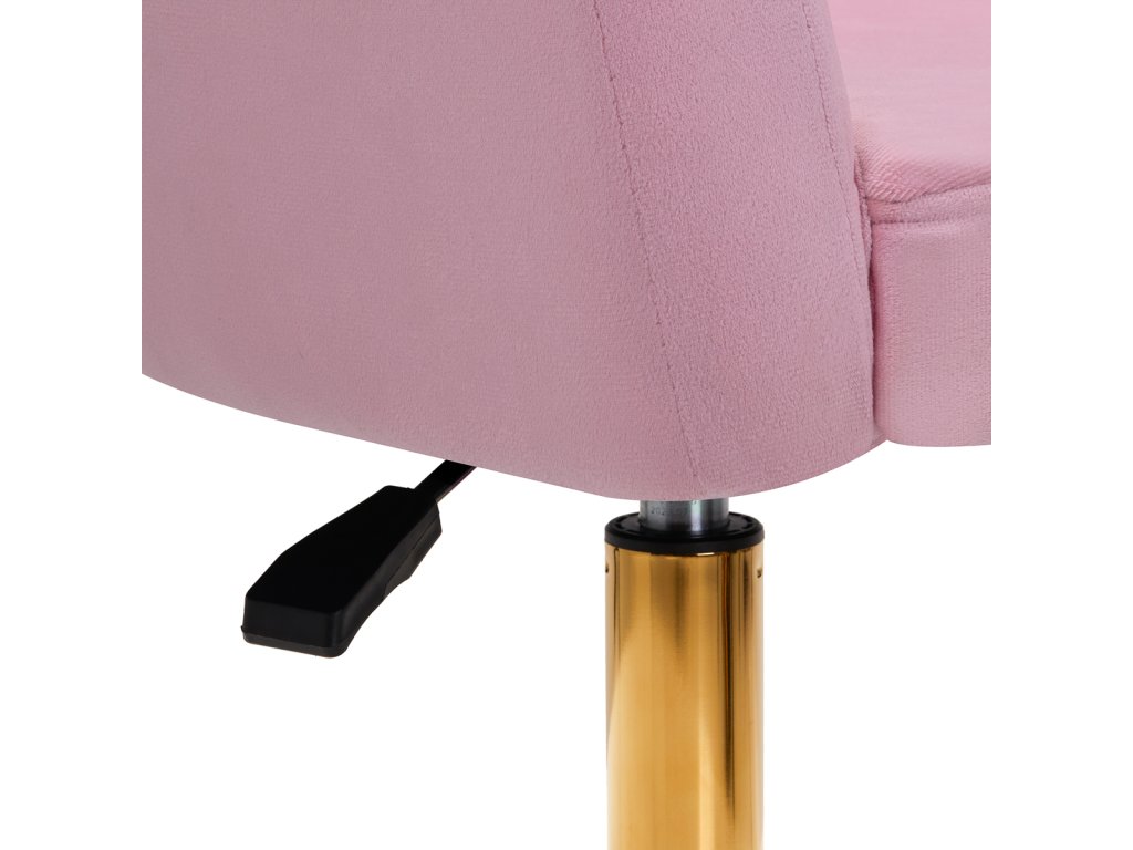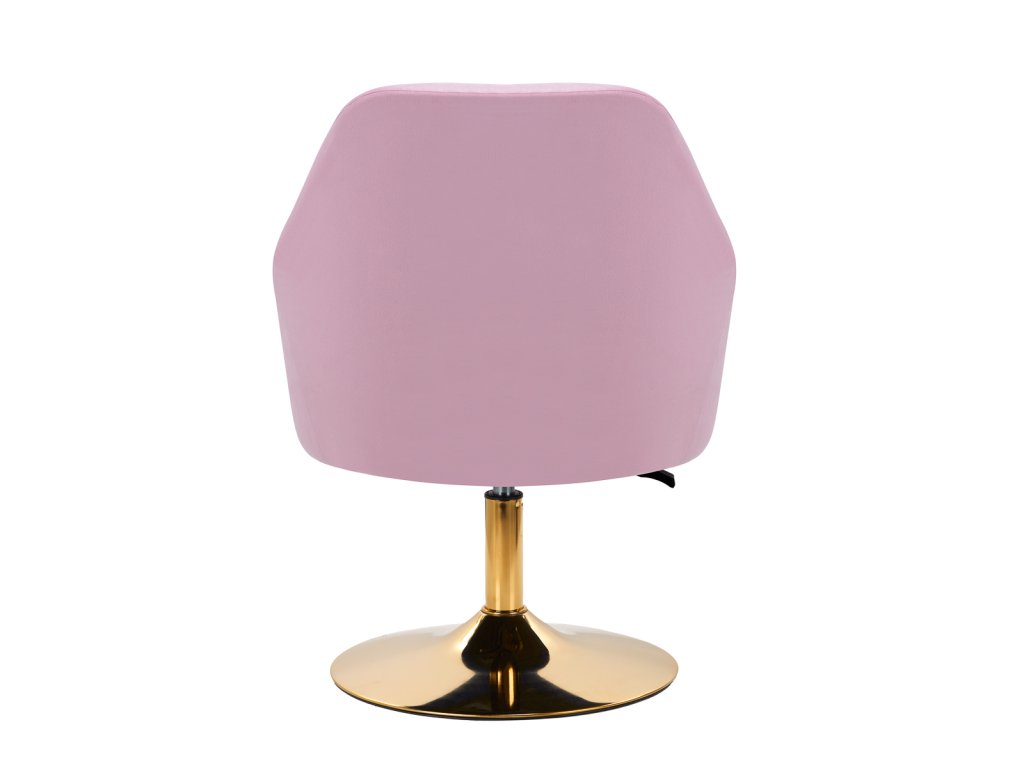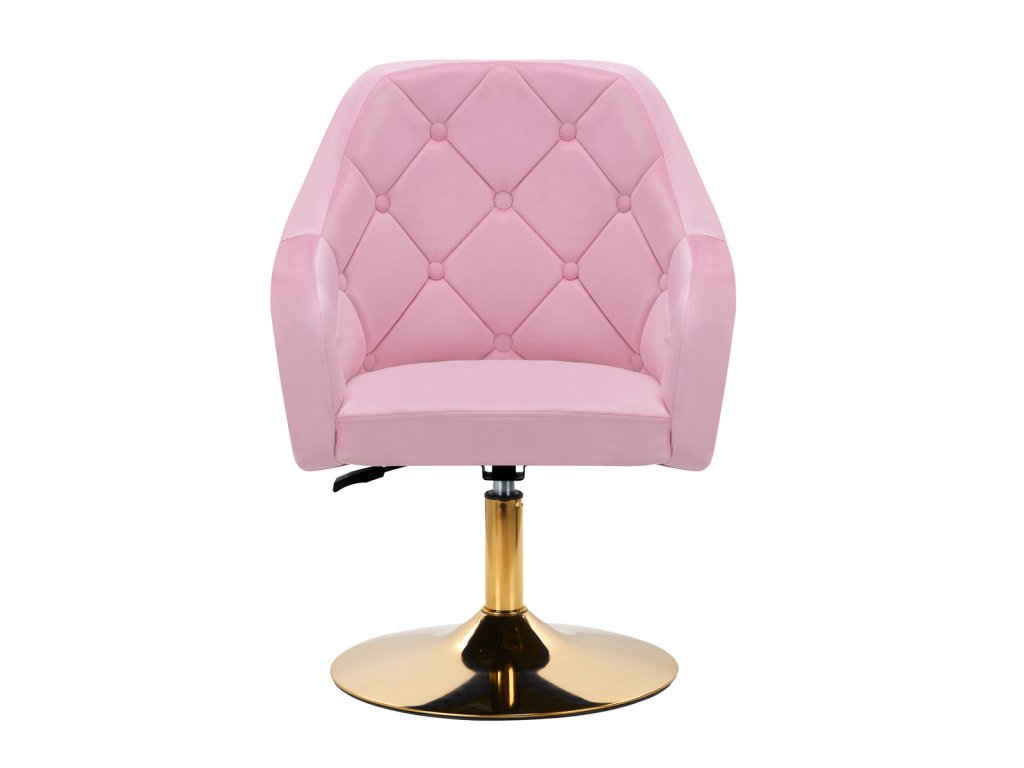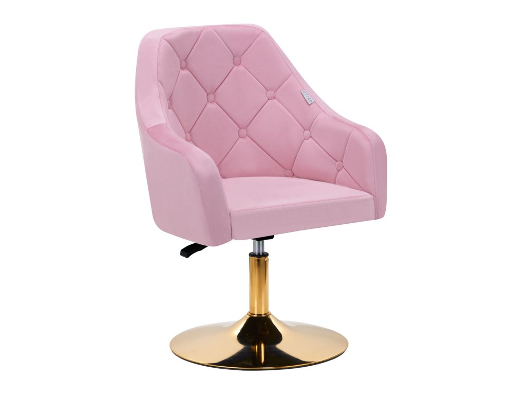 Zaujímavý dizajn dodáva stoličke jedinečný charakter. Na dotyk príjemné zamatové čalúnenie v odtieňoch ružovej adekoratívne prešívanie sa stane ozdobou každého interiéru.Stabilná, okrúhla základňa v zlatých odtieňoch dodáva eleganciu a dokonale ladí so zamatom.Estetika spracovania, pohodlne umiestnené podrúčky, ergonomicky profilované operadlo a estetické prešívanie robia kreslospĺňať požiadavky aj tých najnáročnejších používateľov.