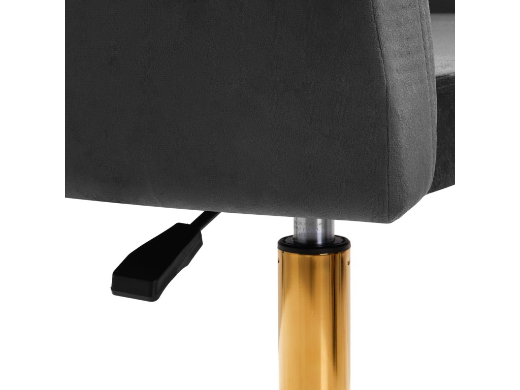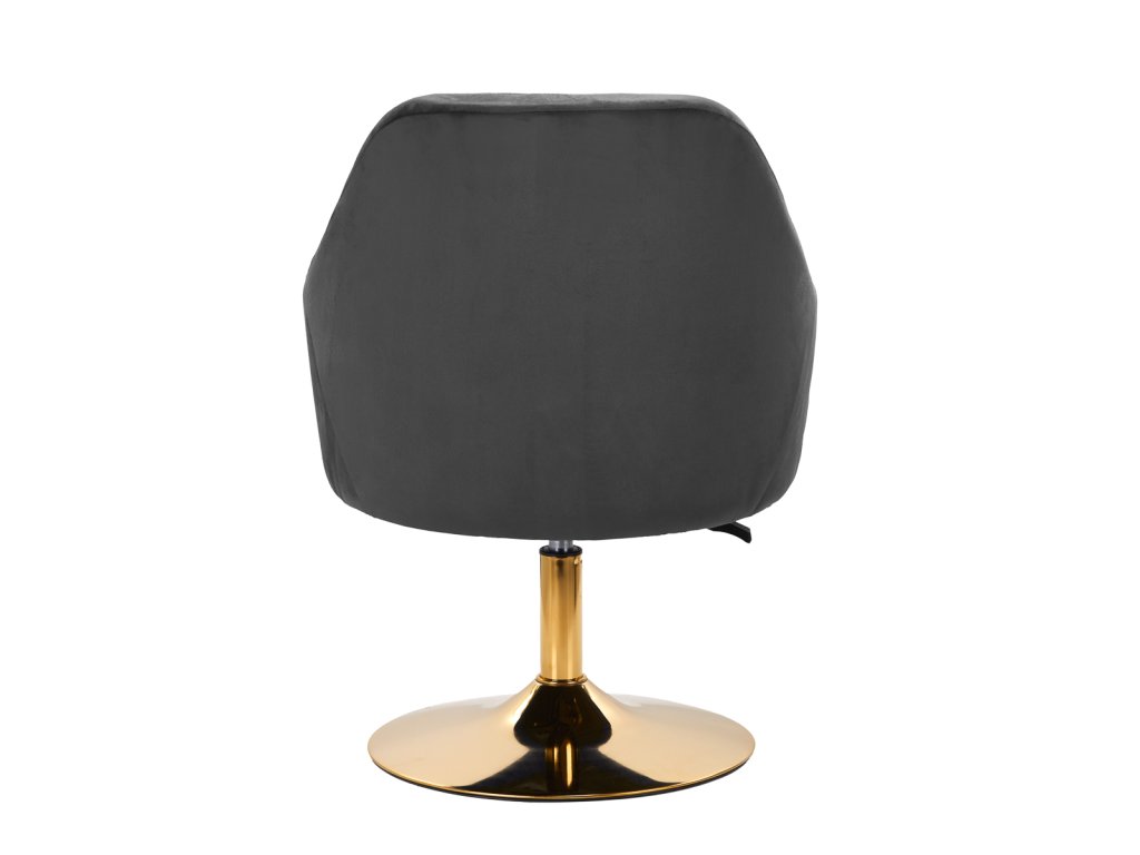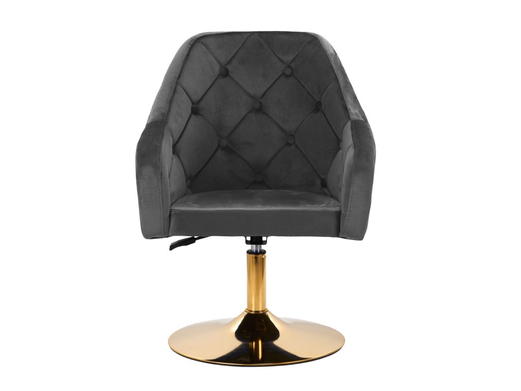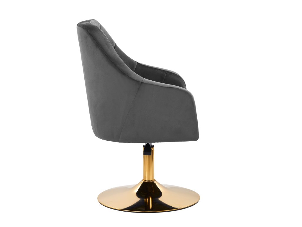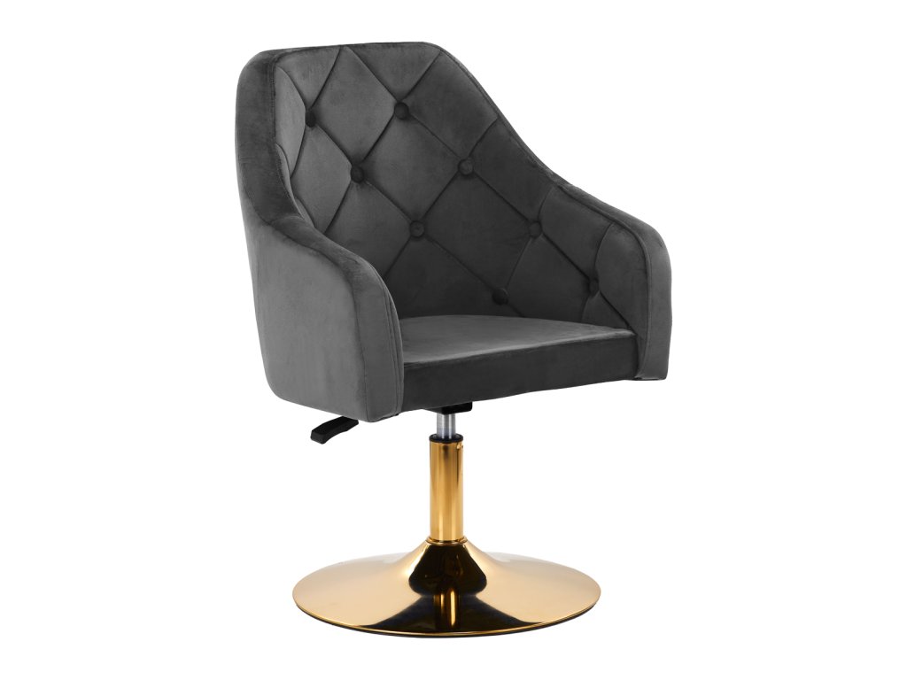 Zaujímavý dizajn dodáva stoličke jedinečný charakter. Na dotyk príjemné zamatové čalúnenie v odtieňoch sivej adekoratívne prešívanie sa stane ozdobou každého interiéru.Stabilná, okrúhla základňa v zlatých odtieňoch dodáva eleganciu a dokonale ladí so zamatom.Estetika spracovania, pohodlne umiestnené podrúčky, ergonomicky profilované operadlo a estetické prešívanie robia kreslospĺňať požiadavky aj tých najnáročnejších používateľov.