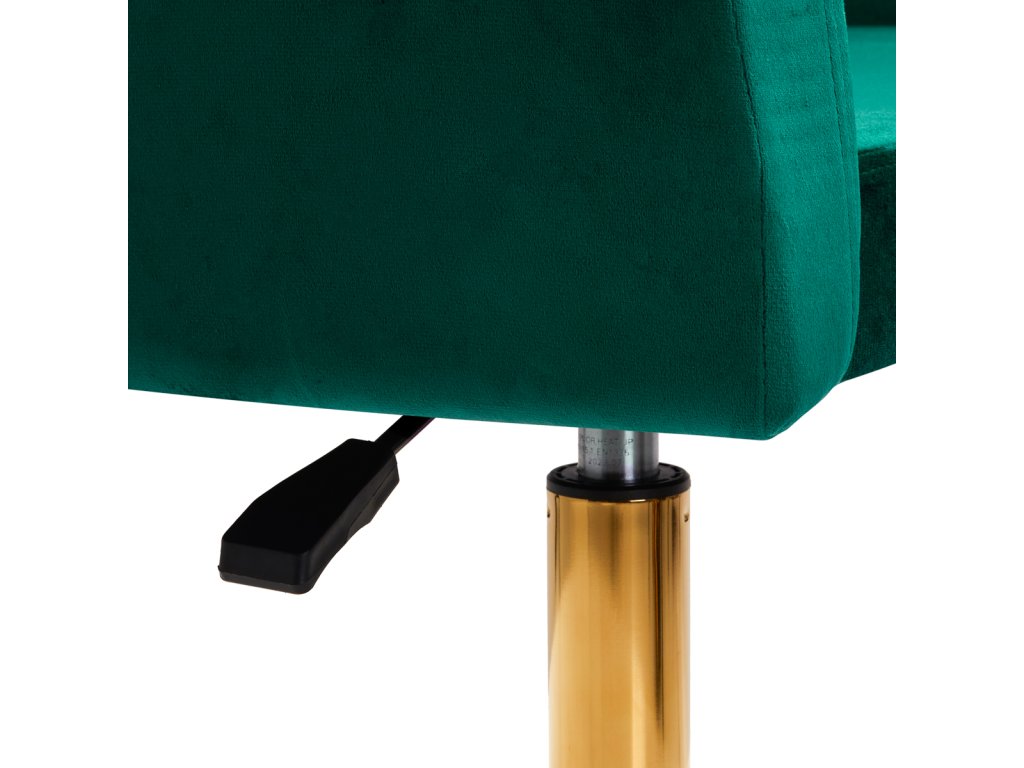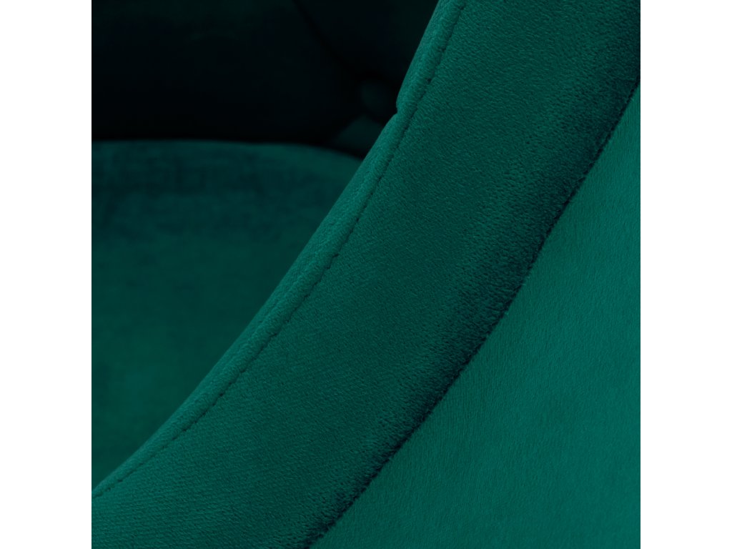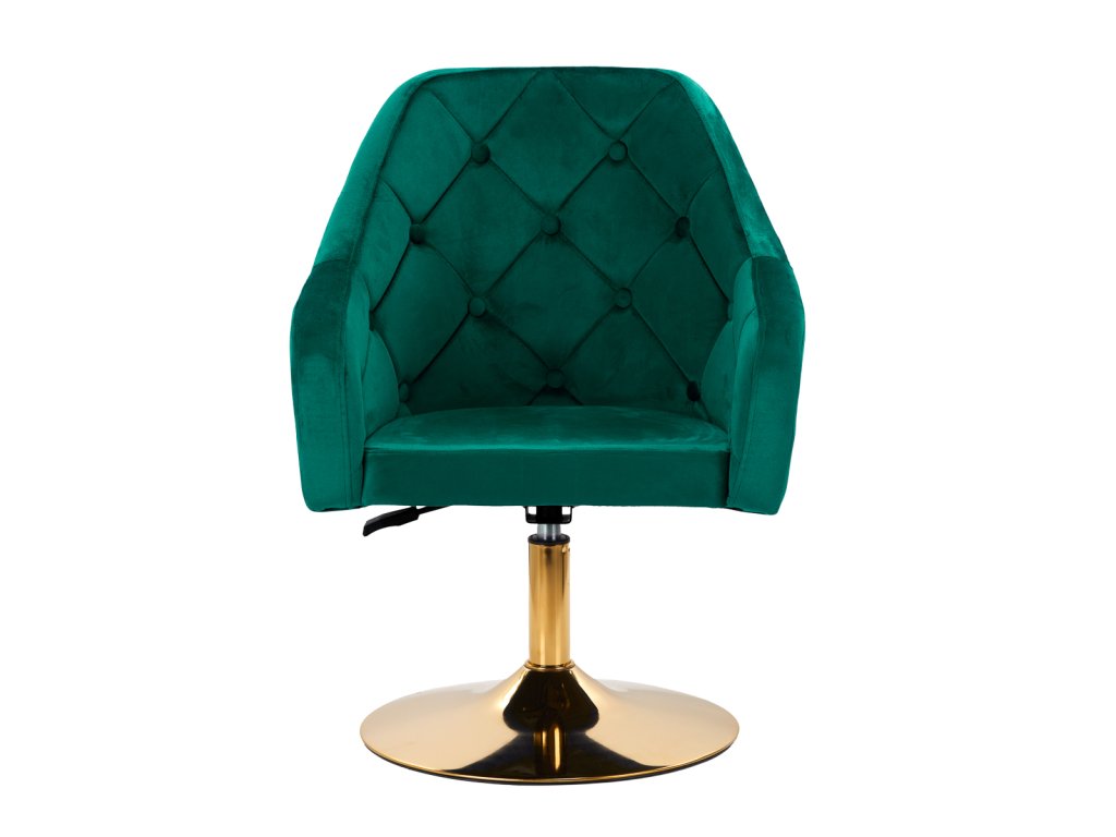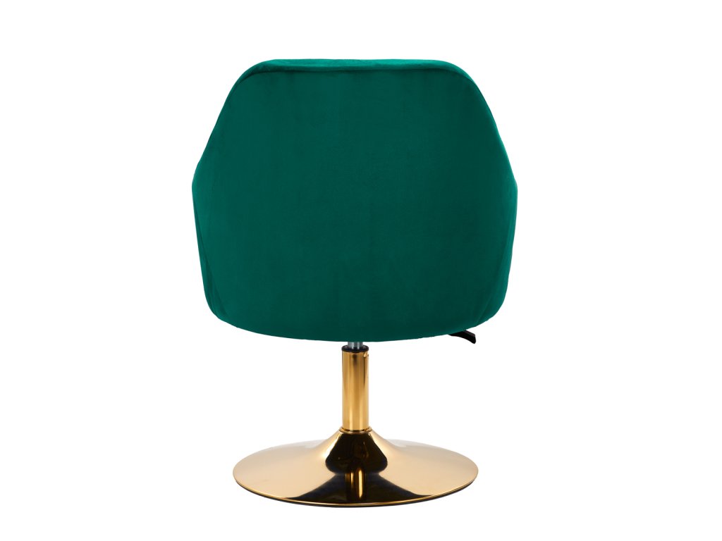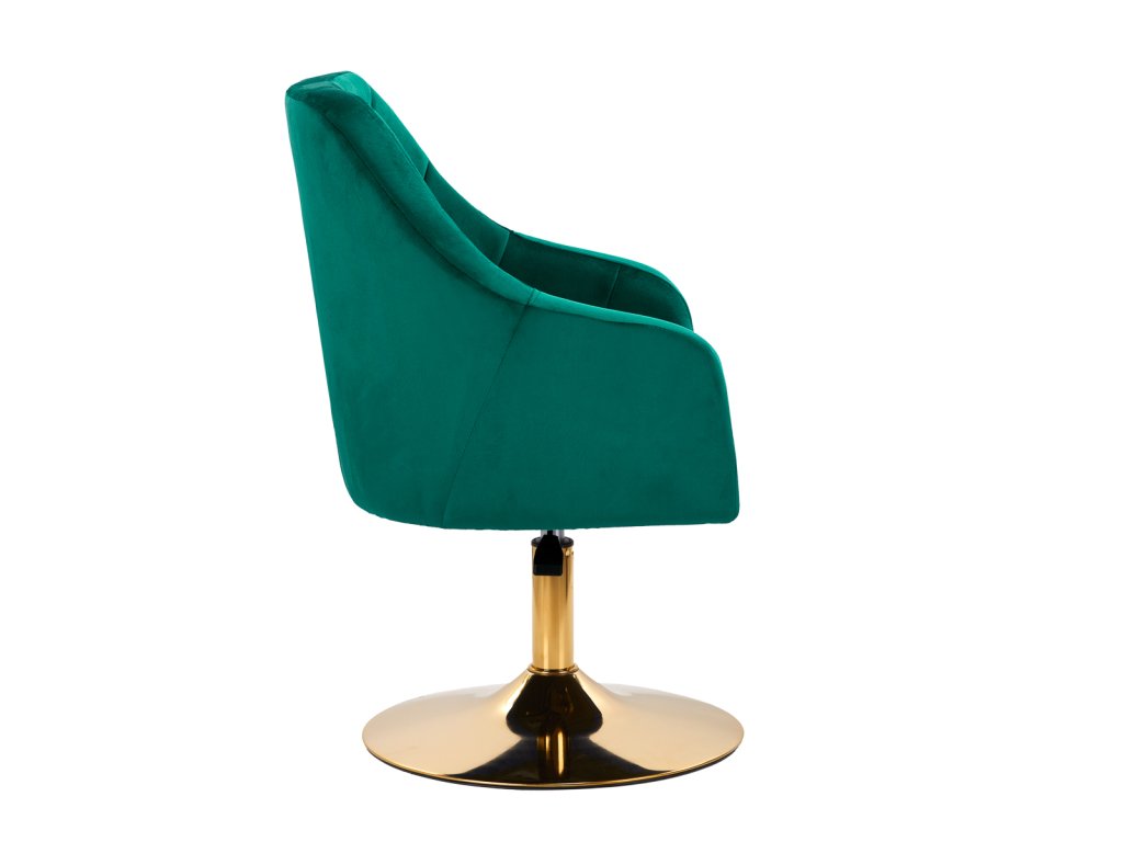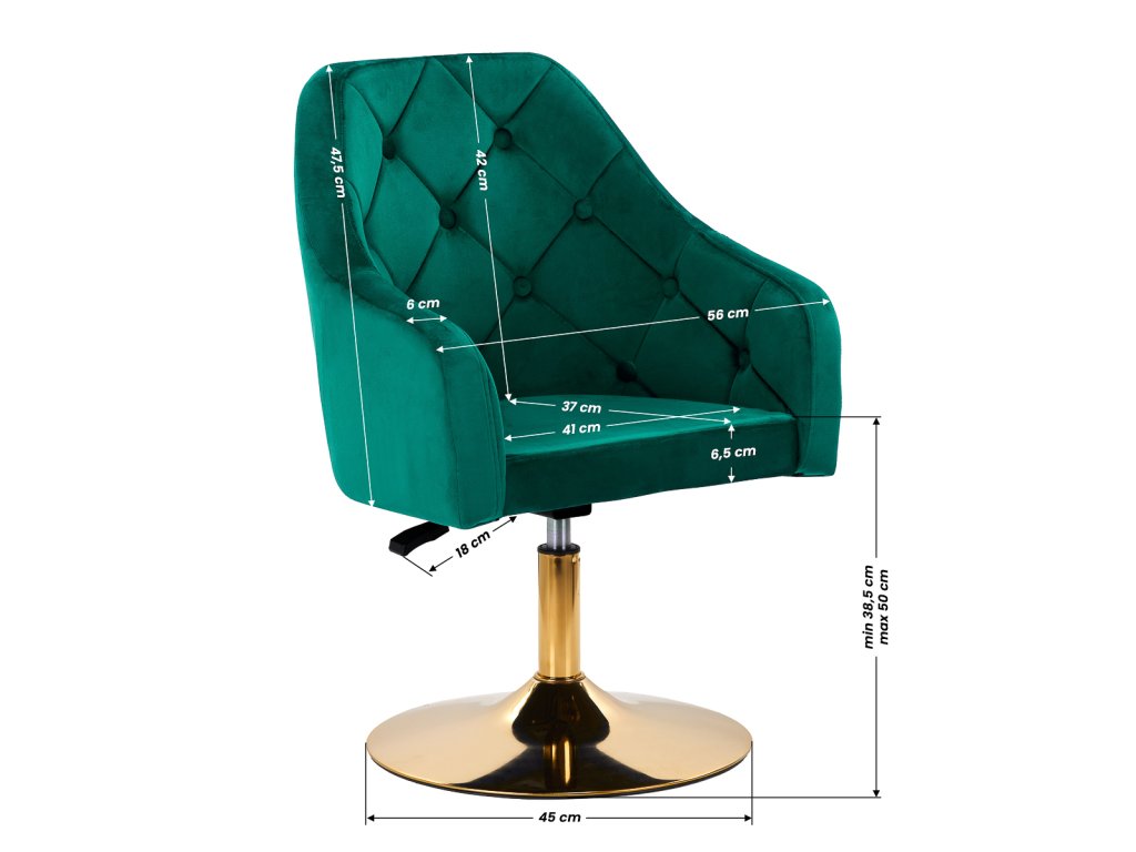 Zaujímavý dizajn dodáva stoličke jedinečný charakter. Na dotyk príjemné zamatové čalúnenie v odtieňoch zelenej adekoratívne prešívanie sa stane ozdobou každého interiéru.Stabilná, okrúhla základňa v zlatých odtieňoch dodáva eleganciu a dokonale ladí so zamatom.Estetika spracovania, pohodlne umiestnené podrúčky, ergonomicky profilované operadlo a estetické prešívanie robia kreslospĺňať požiadavky aj tých najnáročnejších používateľov.