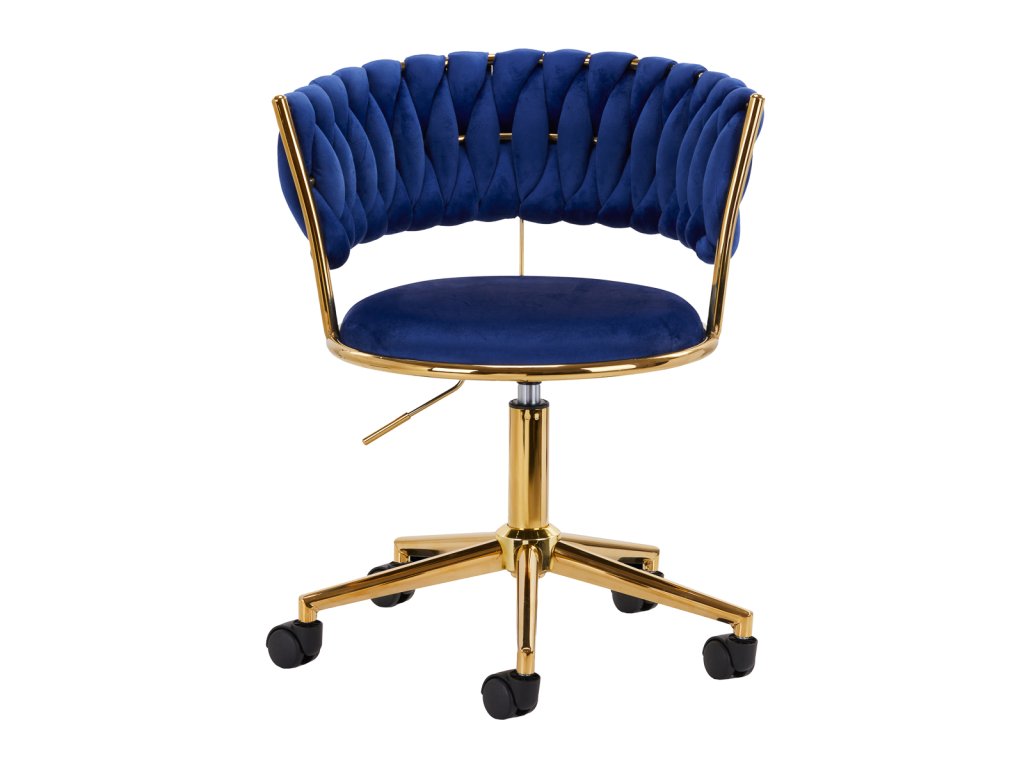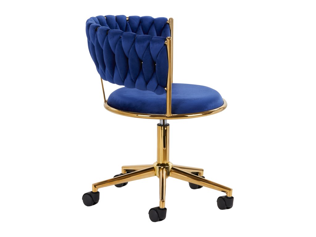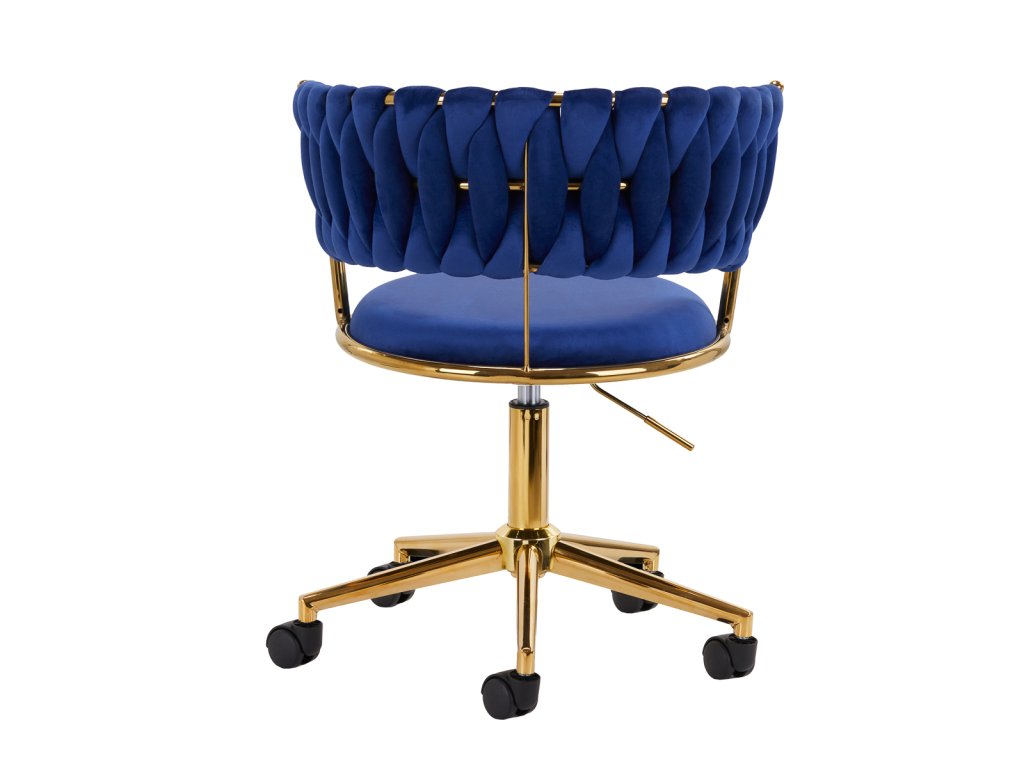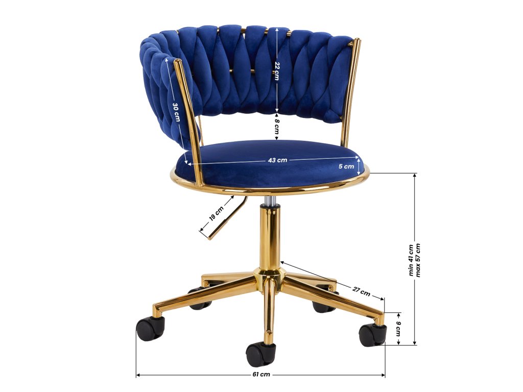 Povrchová úprava robí nábytok pútavým. Na dotyk príjemné zamatové čalúnenie v odtieňoch tmavomodrej farby mu dodáva jedinečný charakter. Podstavec v odtieňoch zlatej dodáva eleganciu a dokonale ladí so zamatom.Funkčné kolieska zabezpečujú mobilitu, čo uľahčuje premiestňovanie kresla a pohyb po salóne počas práce. Vďaka starostlivému spracovaniu, pohodlnému používaniu a esteticky prepleteným materiálom na profilovanom operadle je stoličkasplní požiadavky aj tých najnáročnejších používateľov.