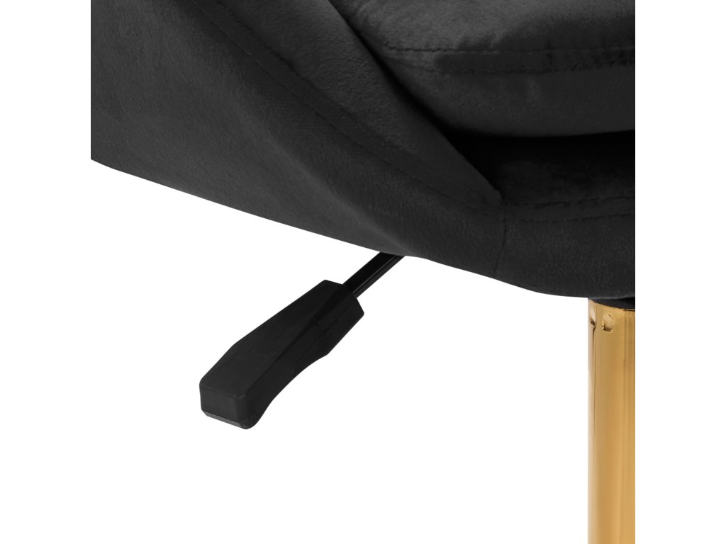 Jednoduchá povrchová úprava robí nábytok pútavým. Na dotyk príjemné zamatové čalúnenie v odtieňoch čiernej farby mu dodávajedinečný charakter. Podklad v zlatých odtieňoch dodáva eleganciu, dokonale ladí so zamatom a funkčné kolieska zabezpečujú mobilitu, čo uľahčuje pohyb kresla po salóne počas práce. Vďaka estetickému spracovaniu, pohodlnému používaniu a ergonomicky profilovanému operadlu je stoličkaspĺňať požiadavky aj tých najnáročnejších používateľov.