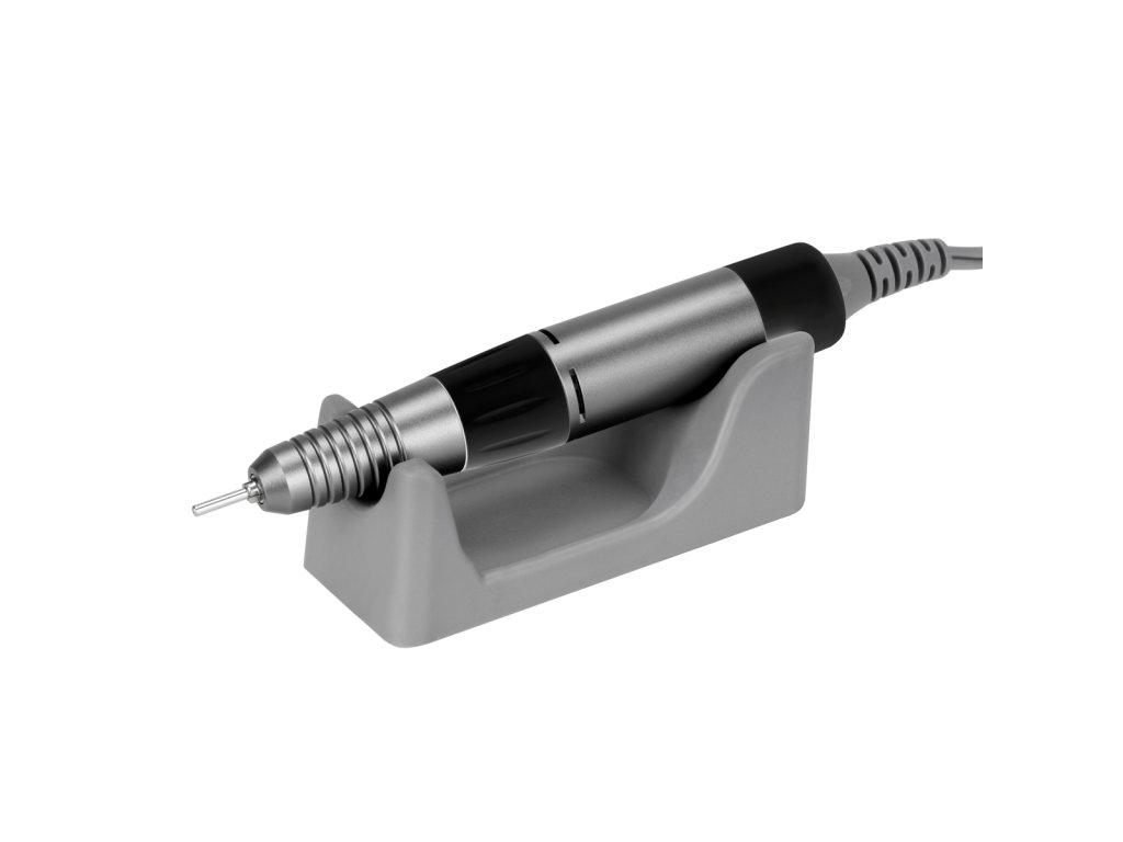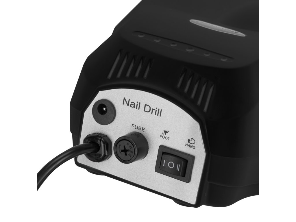 Červená dióda vedľa prepínača označuje prevádzkový stav zariadenia. Rýchlosť otáčania hlavy vŕtačky na klince možno jednoducho a plynulo nastaviť pomocou špeciálneho gombíka v rozsahuod 0 do 35 000 otáčok za minútu. Prepínač na prednej strane zariadeniaúčinne mení smer otáčania, zatiaľ čo ten na zadnej strane umožňujezmena ovládania - medzi rukou a nohou. Sada obsahuje nožný pedál, ktorého funkciou je zapnutie frézky s vopred nastavenými otáčkami.To zaručuje voľnú a pohodlnú prácu, a to vďaka možnosti ovládať zariadenie bez toho, aby ste museli vziať do rúk. Počas prevádzky je možné hlavu bezpečne položiť našpeciálny silikónový stojan alebo zavesené napohodlná plastová rukoväť, ktoré možno namontovať na obe strany zariadenia.
