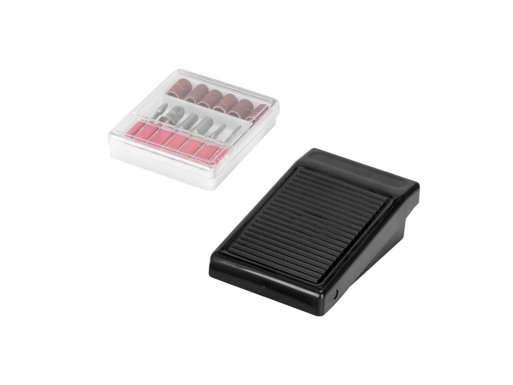 Červená dióda vedľa prepínača označuje prevádzkový stav zariadenia. Rýchlosť otáčania hlavy vŕtačky na klince možno jednoducho a plynulo nastaviť pomocou špeciálneho gombíka v rozsahuod 0 do 35 000 otáčok za minútu. Prepínač na prednej strane zariadeniaúčinne mení smer otáčania, zatiaľ čo ten na zadnej strane umožňujezmena ovládania - medzi rukou a nohou. Sada obsahuje nožný pedál, ktorého funkciou je zapnutie frézky s vopred nastavenými otáčkami.To zaručuje voľnú a pohodlnú prácu, a to vďaka možnosti ovládať zariadenie bez toho, aby ste museli vziať do rúk. Počas prevádzky je možné hlavu bezpečne položiť našpeciálny silikónový stojan alebo zavesené napohodlná plastová rukoväť, ktoré možno namontovať na obe strany zariadenia.