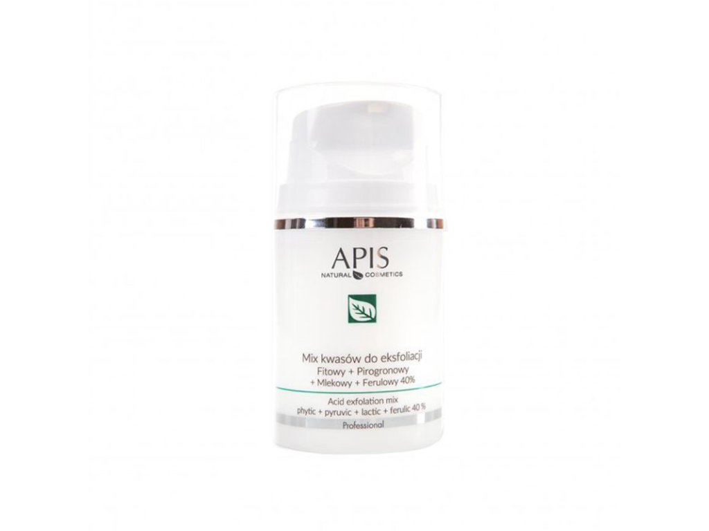 apis zmes kyselín na exfoliáciu (fytová + pyrohroznová + mliečna + ferulová 40 %) odporúčaná pre pleť so známkami starnutia, zmenami farby, rozšírenými kapilárami, ako aj pre mastnú, aknóznu pleť s rozšírenými pórmi. je to inovatívna kombinácia štyroch kyselín s pH 1,4, pôsobiaca na mnohých úrovniach, s neobvyklými vlastnosťami. prípravok intenzívne exfoliuje rohovú vrstvu, má anti-aging vlastnosti, sťahuje rozšírené kapiláry a zosvetľuje zafarbenie. uzatvára rozšírené póry pleti a má bakteriostatický účinok. vykazuje tiež antioxidačnú aktivitu. zmes kyselín je prípravok určený na chemickú exfoliáciu.