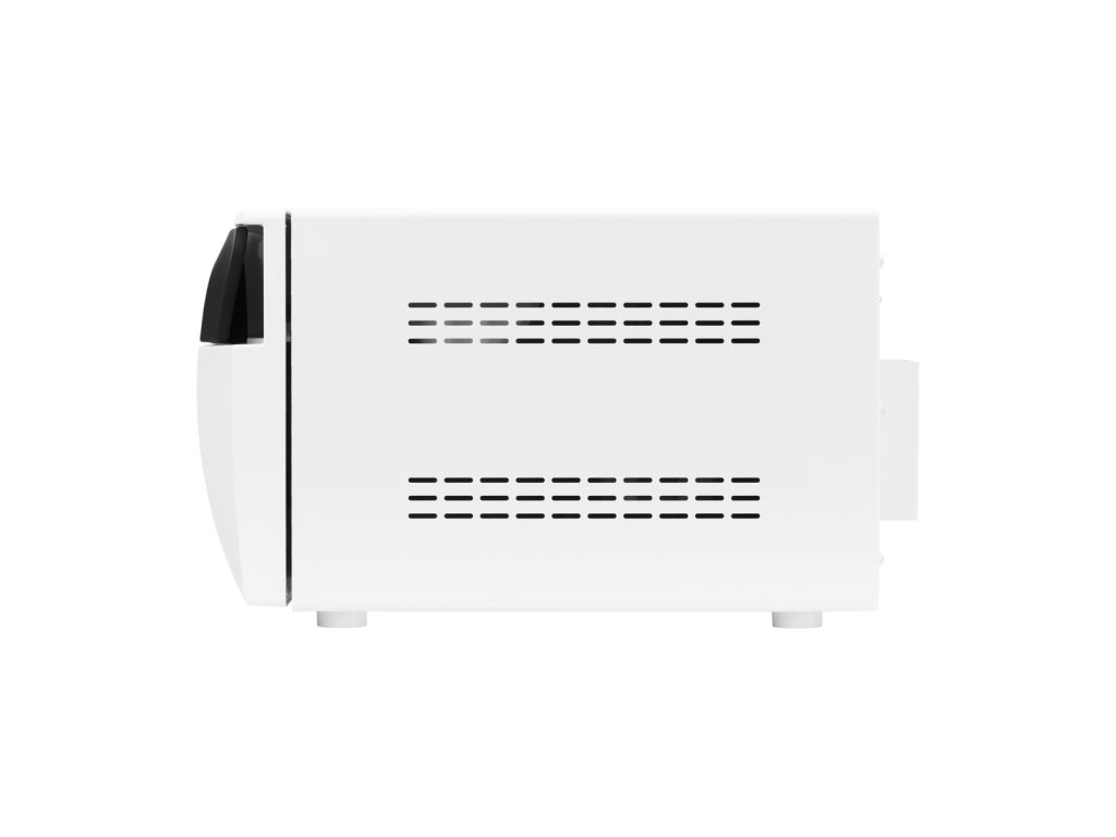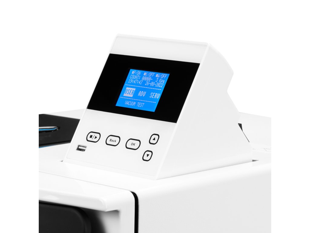 Je to kompaktné zariadenie, ktoré kombinuje23 litrov autokláv so zabudovanou tepelnou tlačiarňou. má LCD displej a Port USB, ktorý umožňuje pripojiť dátový nosič na uloženie výsledkov cyklu. Má10 plne automatických programov; 7 sterilizačných programov, 2 testovacie programy a program čistenia autoklávu. Okrem toho má aj funkcia užívateľského programu, čo umožňuje úplnú voľnosť pri výbere parametrov.Má intuitívne menu a používateľsky prívetivé rozhranie je v angličtine. Stránkafunkcie predhrievania a udržiavania tepla sa ukáže ako veľmi užitočný, najmä keď potrebujete vykonať viac programov a nechcete čakať, kým sa zariadenie zahreje pri spustení každého programu. Autokláv Lafomed Compact Line sa vyznačuje dostupnosťou rýchle sterilizačné programy s možnosťou regulácie času sušenia. Najkratší sterilizačný program vrátane sušenia trvá len 7 minút. Prístroj má zabudovanú nádrž na čistú (destilovanú) vodu, ktorá sa používa na sterilizáciu, ako aj nádrž na použitú vodu s možnosťou vypúšťania v prednej časti prístroja. Systém autodiagnostiky účinne chráni pred poškodením a zachováva životnosť zariadenia. Dodatočnú bezpečnosť poskytuje systém dvojitého uzamykania dverí. Od ostatných autoklávov Lafomed sa odlišuje tým, že neobvykle veľká kapacita nádrží na čistú a použitú vodu - až 2,5 litra! Vďaka tomu nebudete musieť často dopĺňať a vypúšťať vodu.