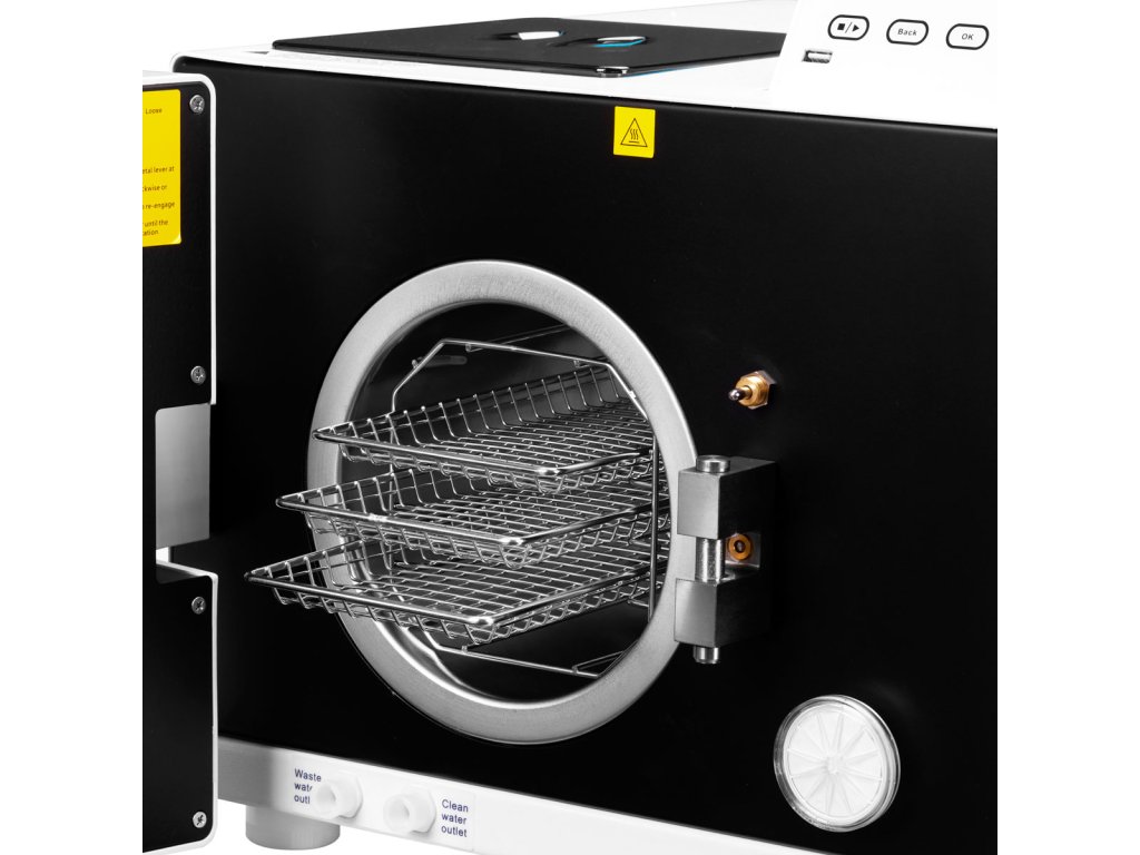 Zabudované nádrže na čistú a použitú vodu | Každá nádoba má objem 2,5 litra. Nádrž na čistú vodu je určená na destilovanú alebo deionizovanú vodu používanú na sterilizáciu. Prítomnosť nádržky na použitú vodu znamená, že nemusíme pamätať na externú nádobu. Odtok použitej (a čistej) vody sa nachádza na prednej strane prístroja. |
