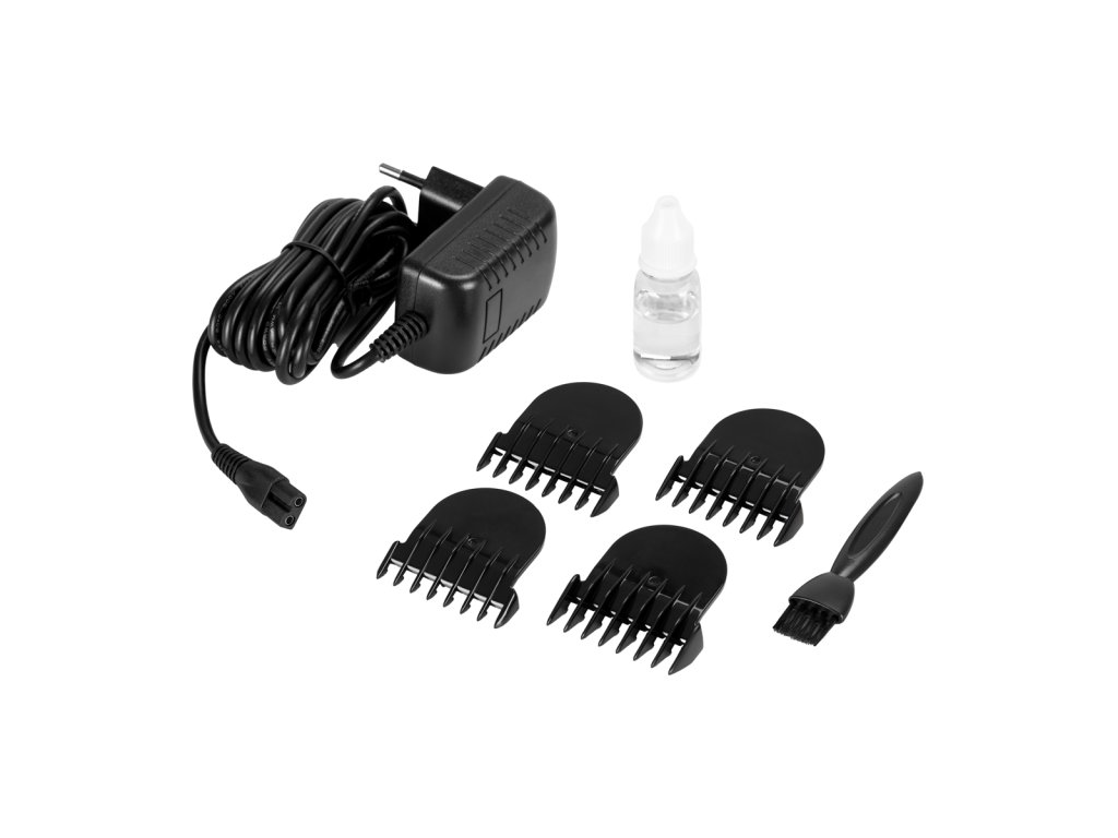 Zahrnuté: zastrihávač, štyri plastové krytky (1,5 mm; 3 mm; 4,5 mm; 6 mm), napájací adaptér, čistiaca kefka, fľaša oleja na údržbu.