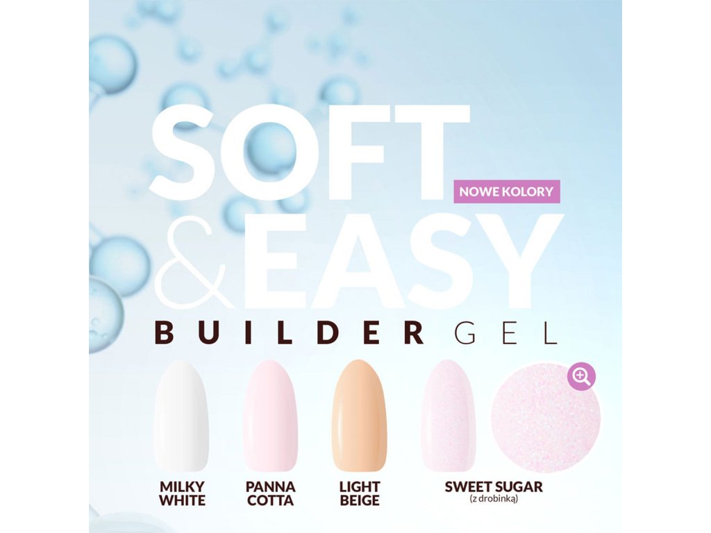 Inovatívne zloženie gélu s jedinečnou štruktúrou a hustotou ho dokonale vyrovnáva, takže odpustí chyby aj nie veľmi skúsenému používateľovi, rýchlu prácu uľahčuje aj tixotropia (tekutá pamäť), ktorá zabraňuje stekaniu na kožičku. Styling so SOFT&EASY nevyžaduje pilovanie ani Top - stačí zotrieť disperznú vrstvu s Cleanerom a intenzívne lesklé nechty sú pripravené!