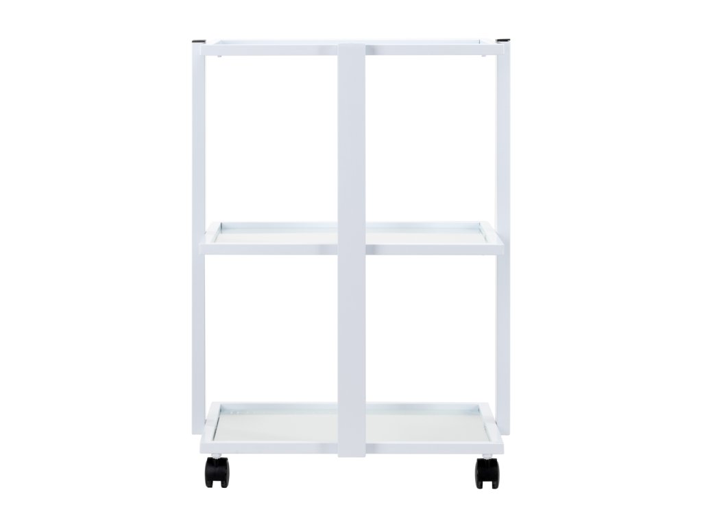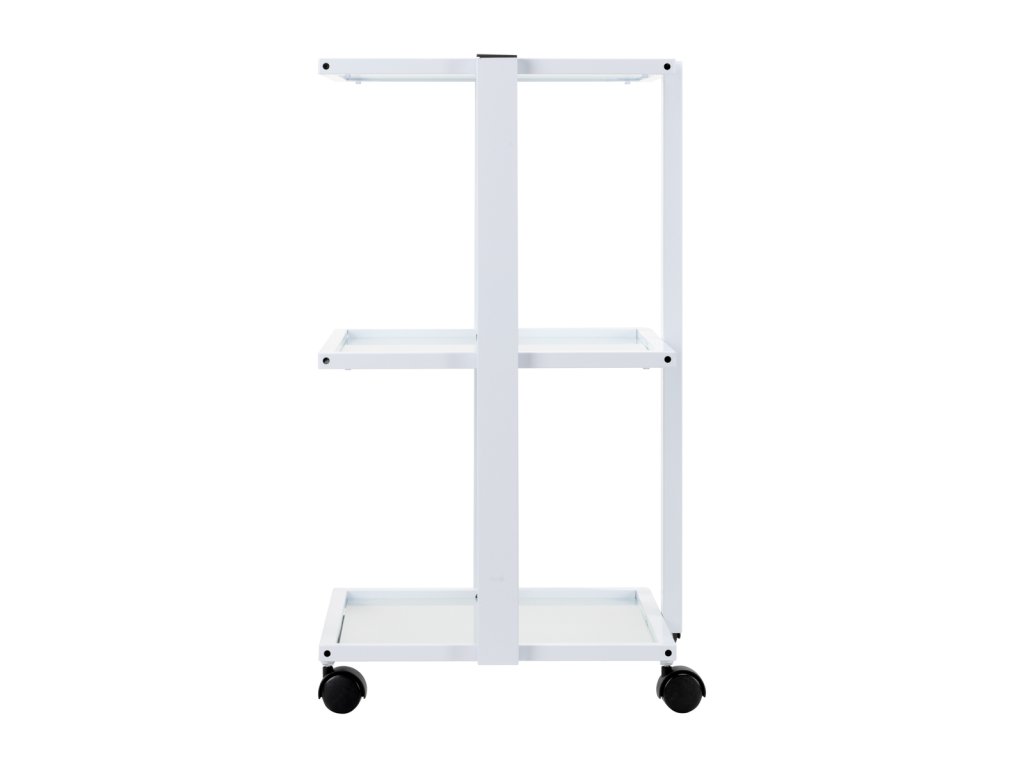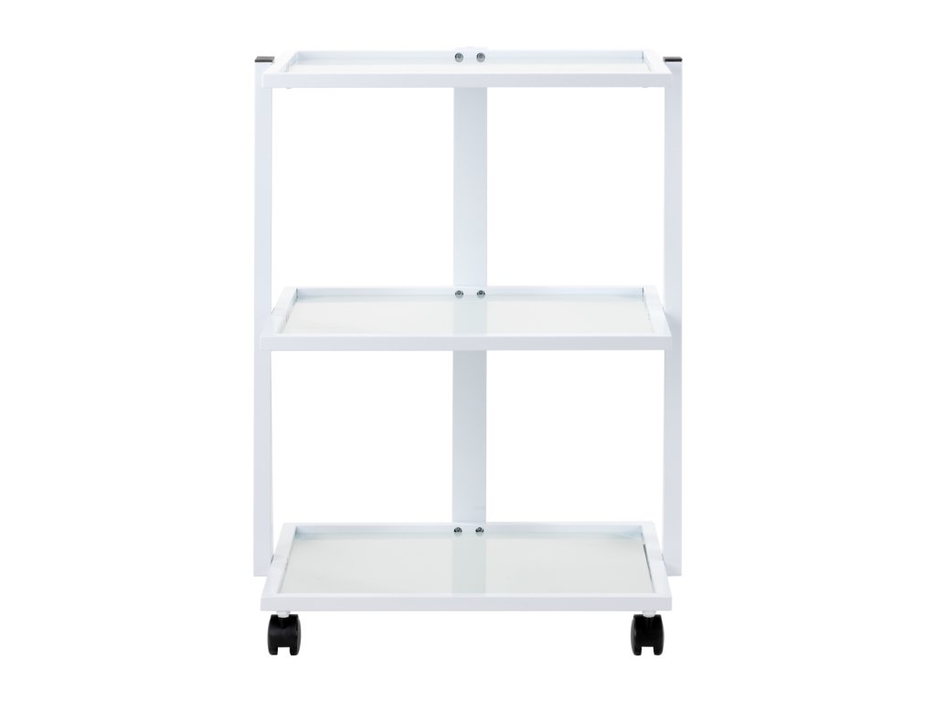 Jednoduchá konštrukcia, arám z odolného hliníka v odtieňoch bielej a sklenenými policami spájajú eleganciu s praktickosťou,zabezpečenie trvanlivosti a stability nábytku. Hladké povrchy uľahčujú udržiavanie stola v čistote aštyri kolieska umožňujú voľný pohyb, čo zvyšuje komfort práce v salóne. Elegantná povrchová úprava zdôrazňuje profesionálny charakter interiéru. Na ráme stola je špeciálne miesto, ktoré umožňujejednoduchá montáž profesionálnej lupy.