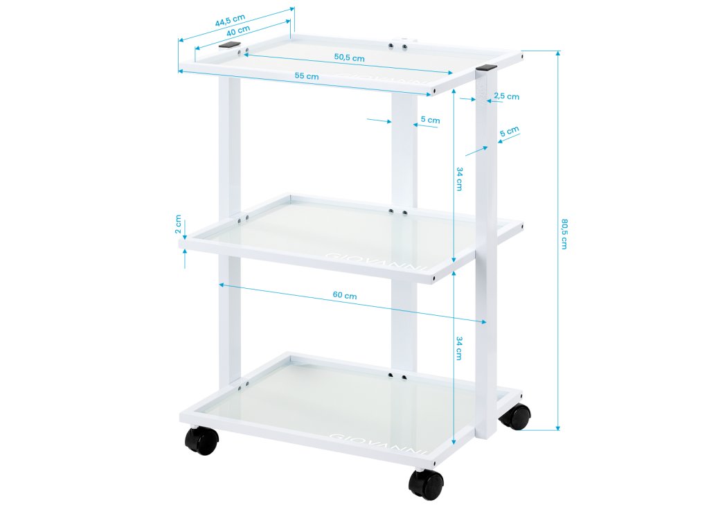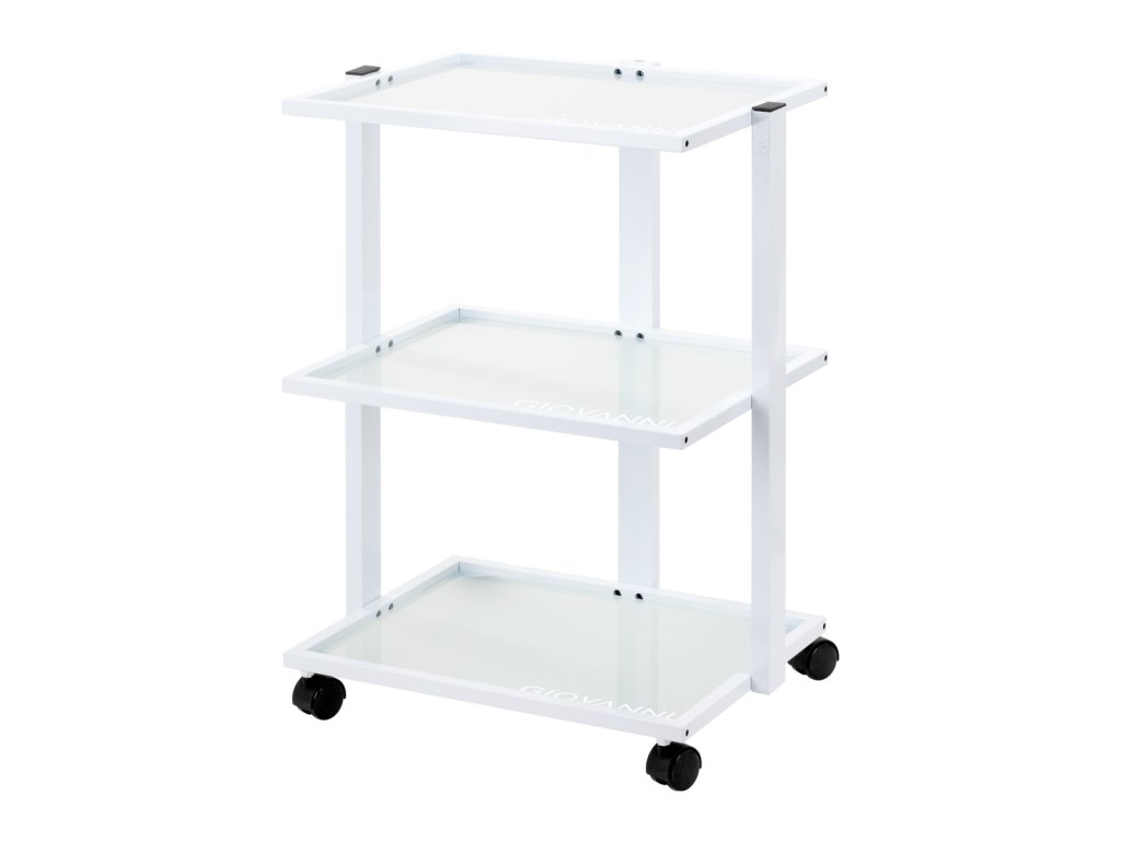 Kozmetický stolík Giovanni E40 je funkčný nábytok, ideálny pre salóny krásy a SPA.Stabilná, ale ľahká konštrukcia zaručuje pohodlie pri práci a ľahkú ovládateľnosť.Tri sklenené police umožňujú pohodlné usporiadanie kozmetiky, príslušenstva a vybavenia potrebného na ošetrenie.Minimalistická povrchová úprava zdôrazňuje profesionálny charakter stola.