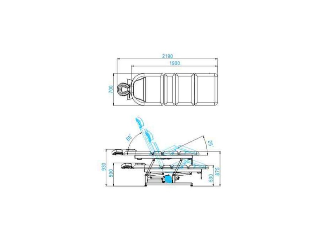 vysoko výkonné lehátko, najmä na fyzioterapeutické procedúry. vybavené 1 motorom, vďaka ktorému je výška elektricky nastaviteľná, operadlo a opierka nôh sú nastaviteľné manuálne. opierka hlavy je vankúš s ventilačným otvorom.