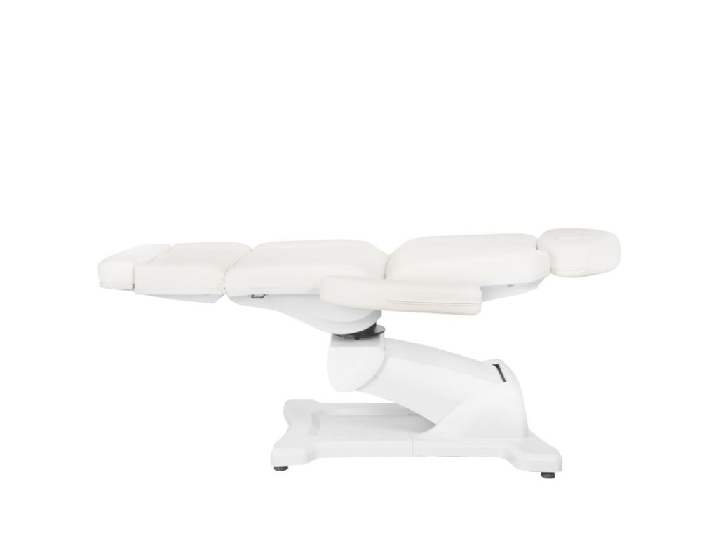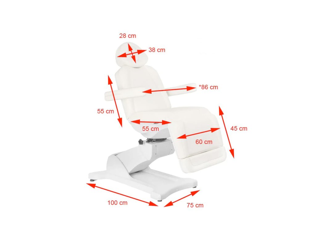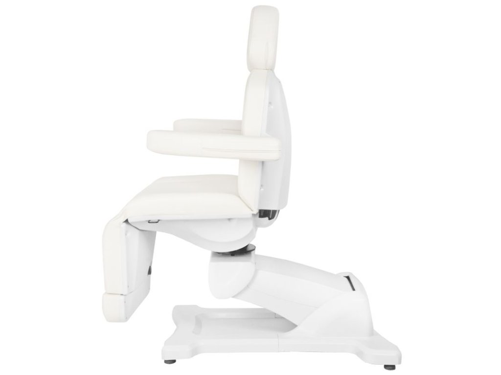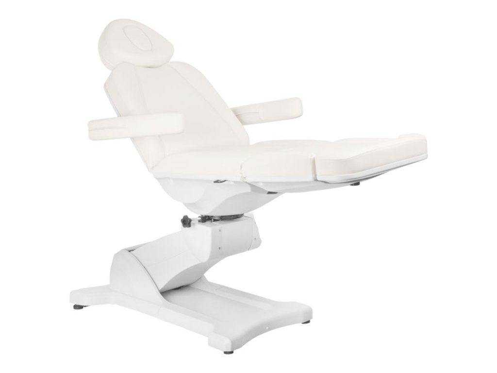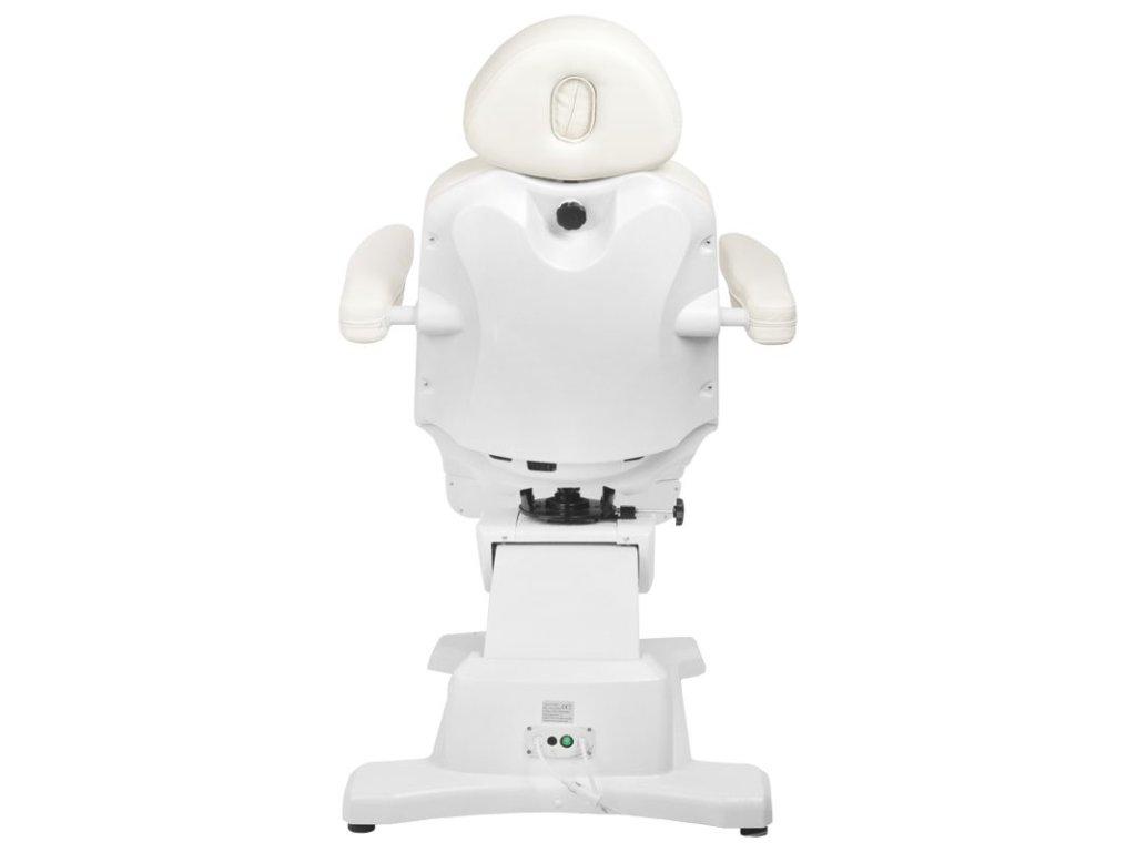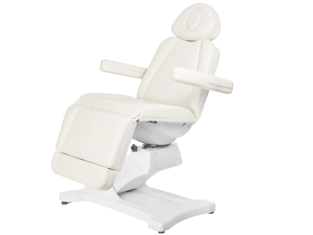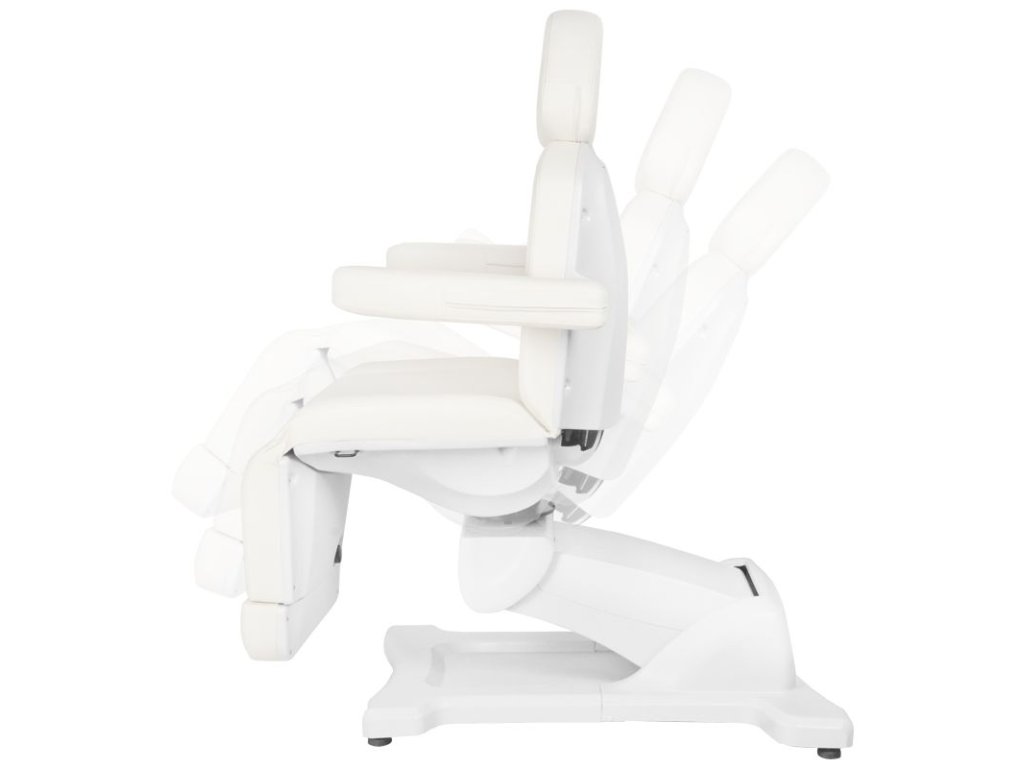 elektrické kozmetické kreslo, ideálne pre kozmetické salóny a kúpeľné salóny. vďaka nezávislým motorom umožňuje nastavenie kresla v 4 rovinách pomocou diaľkového ovládania, čo umožňuje vykonávať ošetrenia tváre a tela. Kreslo má inovatívne riešenie, ktoré umožňuje otočenie sedadla o 180 stupňov okolo svojej osi. pomocou diaľkového ovládania môžeme nastaviť výšku kresla, sklon operadla a opierky nôh a nastaviť sedadlo do polohy kolísky.
