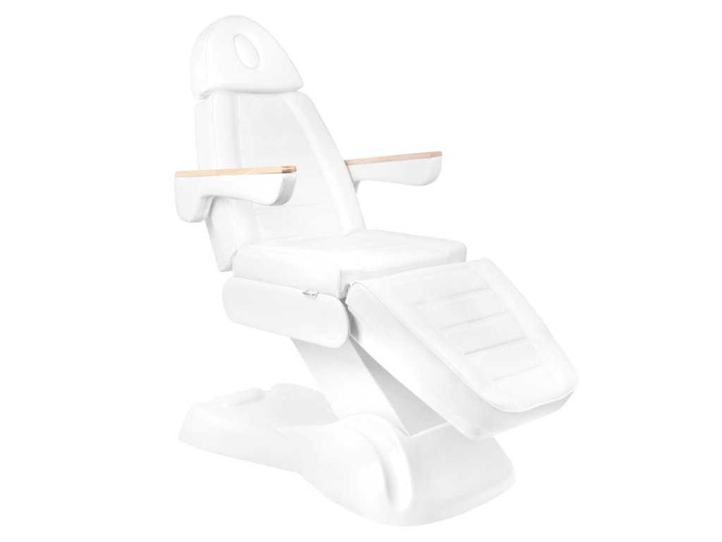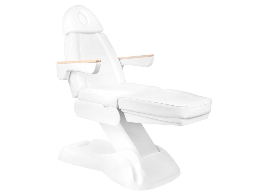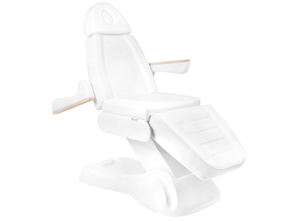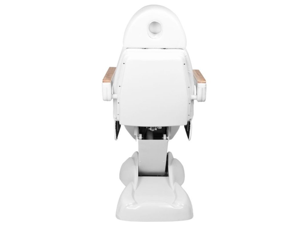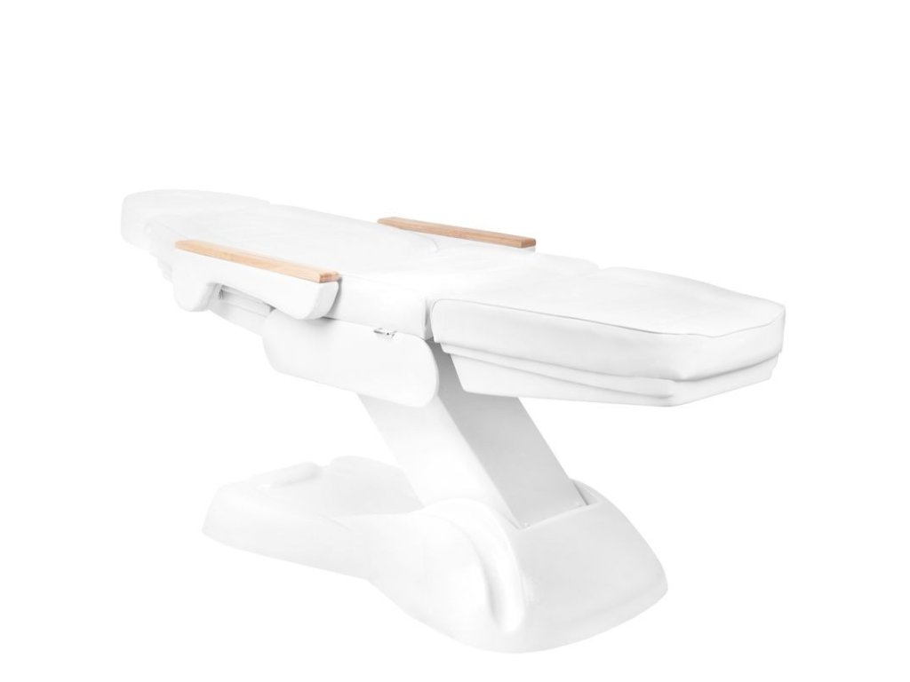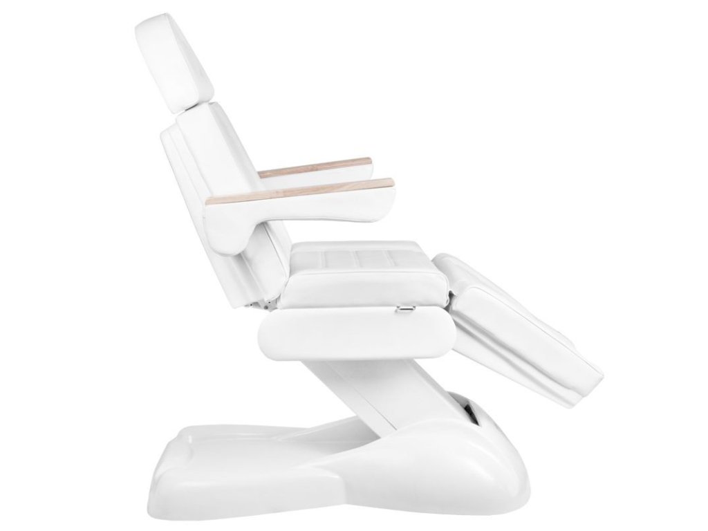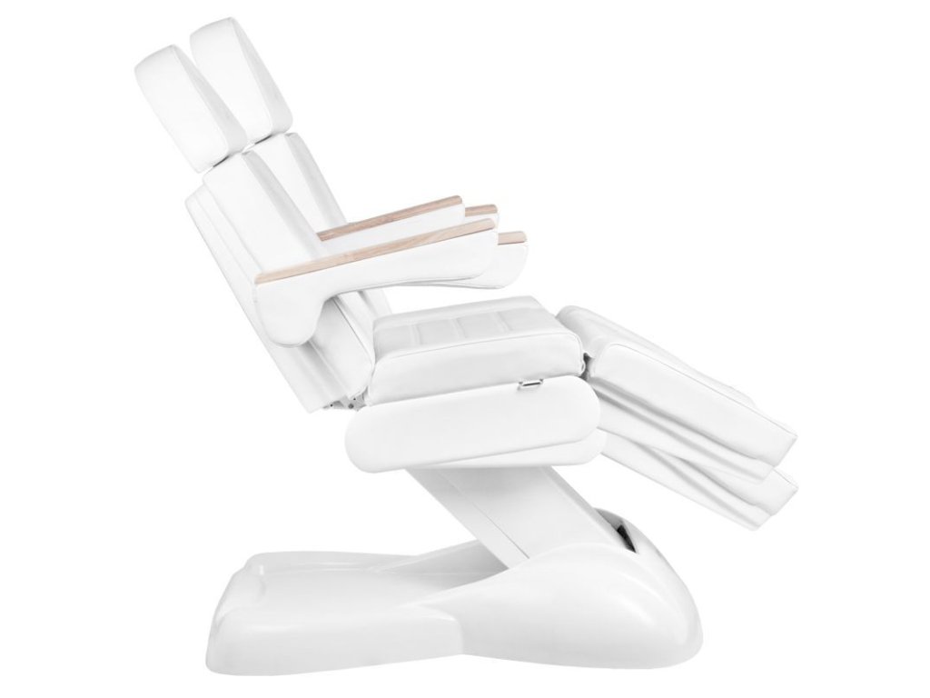 Kreslo je tiež vybavené pohyblivými podrúčkami, výsuvnou opierkou hlavy a kovovým držiakom na zavesenie diaľkového ovládania. Kreslo je vyplnené penou primeranej tvrdosti a potiahnuté na dotyk príjemnou syntetickou kožou v odtieňoch bielej farby, vďaka ktorej je zariadeniepohodlné používanie, odolnosť voči vlhkosti a jednoduché čistenie. Ozdobné drevené prvky na podrúčkach odlišujú stoličku od ostatných modelov a predstavujú vizuálne atraktívny, elegantný akcent. Správne profilované lemy dodávajú stoličkeštýlový vzhľad a ergonomické sedadlo.