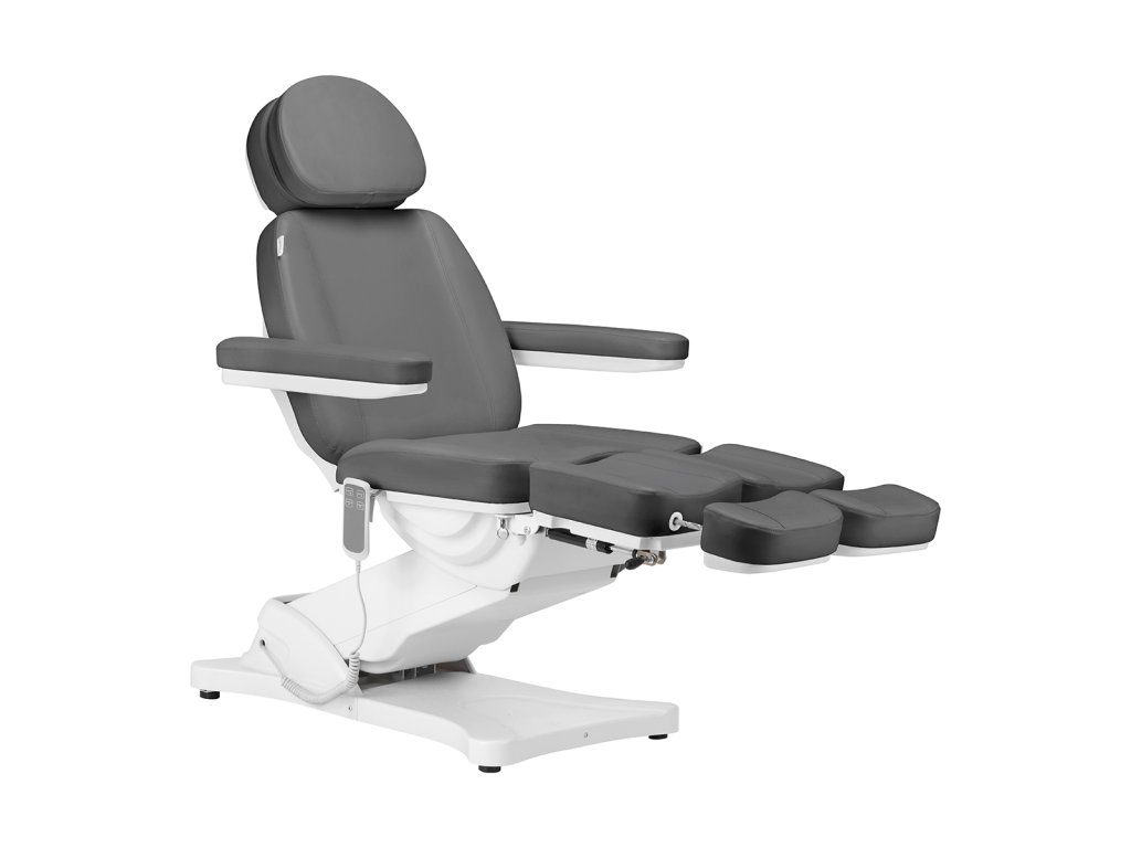 Kreslo jedokonale prispôsobené na vykonávanie podiatrických ošetrení - delená opierka nôh uľahčuje pohodlné vykonávanie služieb a umožňujenezávislé polohovanie nôh. Uhly, pod ktorými sa nachádzajú jeho časti sa nastavujú ručne. Špeciálne navrhnutý mechanizmus umožňuje opierky na nohy naklonené do strán tiež. Predĺženie opierky nôh sa dá tiež nastaviť, čo poskytuje lepšiu oporu pre vyšších používateľov. Všetky tieto vlastnosti zabezpečujú vysoký komfort používania.