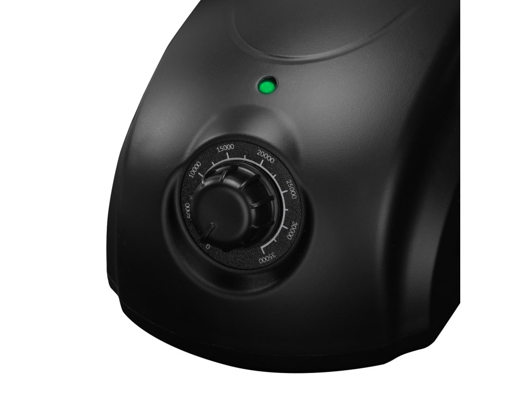 Vŕtačka na klince je vybavená gombíkom so stupnicouna plynulé nastavenie otáčok od 5 000 do 35 000 ot/min. Zelená LED dióda signalizuje, že zariadenie je pripravené na prevádzku.Systém CLICK zabraňuje nedostatočnému utiahnutiu gombíka - charakteristické cvaknutie potvrdzuje správne nastavenie,ochrana motora pred preťažením a predĺženie životnosti zariadenia. Prepínače umiestnené na bočnej strane krytu umožňujú meniť smer otáčania.