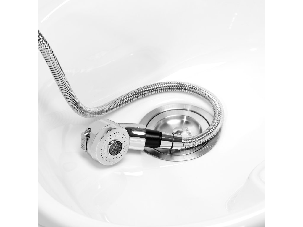 Kadeřnícka umývacia jednotka je vybavenázmiešavacia batéria, ktorá zabezpečuje stály prístup k teplej a studenej vode. Vďaka tomu môžete ľahko nastaviť teplotu podľa preferencií zákazníka.Sprchová hlavica so 120 cm dlhou hadicou a vyhradené miesto na jeho uloženie, uľahčujú prácu a zároveňchrómová zátka so špeciálnym sitkom umožňuje regulovať prietok vody a udržiavať vysoké hygienické štandardy v salóne.Pripojenie vody bola umiestnená vo vnútri stĺpa, čo umožňuje efektívne skryť všetky potrubia, pričomľahko odnímateľný panel poskytuje v prípade potreby bezproblémový prístup. Kreslo je profilované tak, aby zabezpečilo pohodlie počas rôznych procedúr, zatiaľ čo opierka na nohy poskytujevýborná opora pre nohy. Vďaka kombinácii funkčnosti a vybavenia bude práca v kaderníckom salóne ešte pohodlnejšia.