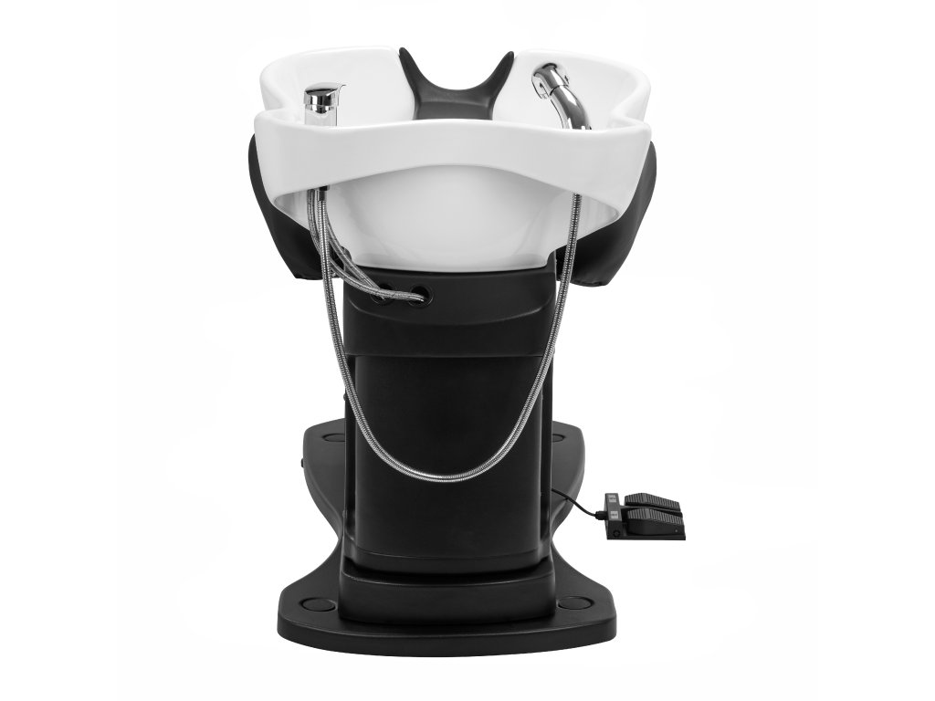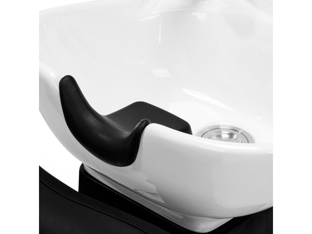 Hĺbka keramickej misy umývadla v odtieňoch bielej farby umožňuje pohodlné aefektívne vykonávanie širokej škály kaderníckych služieb, čím sa zabráni nadmernému striekaniu vody a výrobkov používaných počas ošetrenia. Vďaka použitému materiálu je umývadlotrvanlivé, odolné voči zmene farby a poškriabaniua veľmi ľahko sa udržiava v čistote.Správne profilovaný golier poskytuje pohodlie počas umývania vlasov. Použitiešpeciálna podpora v miske zaručuje správnu oporu hlavy, aby jej váha nespočívala na krku. Toto inovatívne riešenie zabraňuje napätiu a nepohodliu v oblasti krku azaručuje vysoký komfort, a to aj počas dlhej liečby. Okrem toho vďakapohodlné čierne plastové prekrytie, zákazník nebude pociťovať nepríjemný chladný keramický povrch.