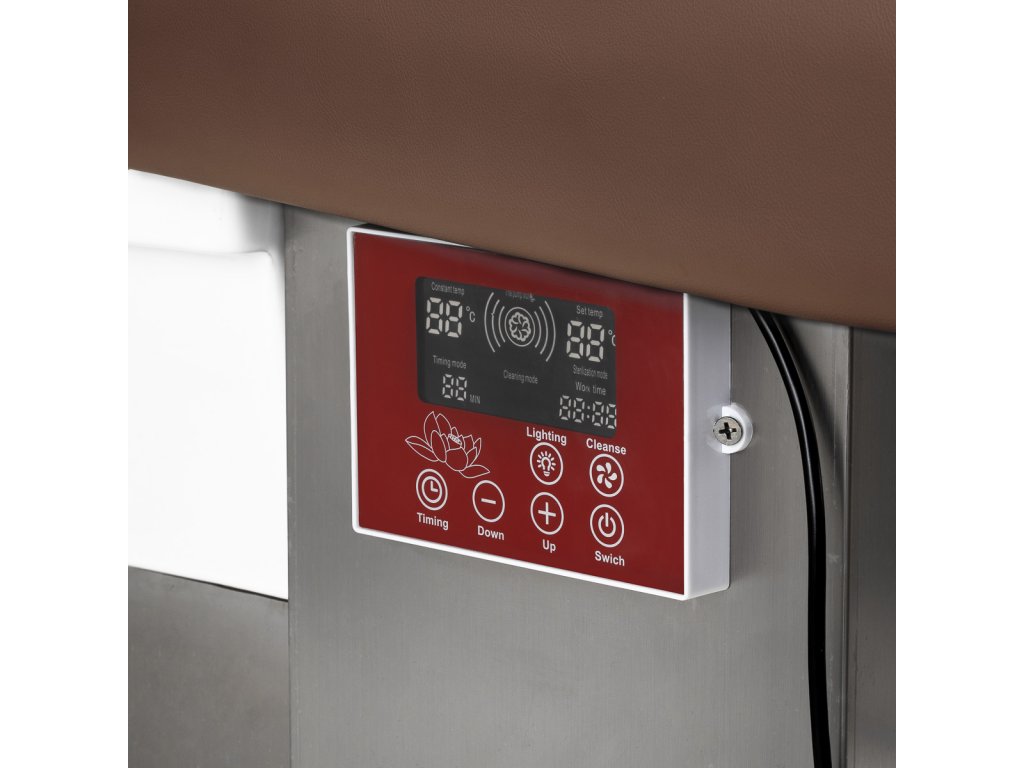 Intuitívny dotykový panel poskytuje úplnú kontrolu nad funkciami umývacej jednotky. Umožňuje nastaviť čas prevádzky a teplotu vody, ako aj sledovať ich aktuálne hodnoty. Vďaka zabudovaný displej, môžete kedykoľvek skontrolovať, ako dlho zariadenie pracuje. Panel vám tiež umožňujeaktivácia funkcie svetelnej terapie, t. j. osvetlenie misky, čo vytvára atmosféru relaxu a luxusu. Okrem toho,zariadenie na parnú terapiu je vybavené diaľkovým ovládaním, čo umožňuje pohodlné diaľkové ovládanie.