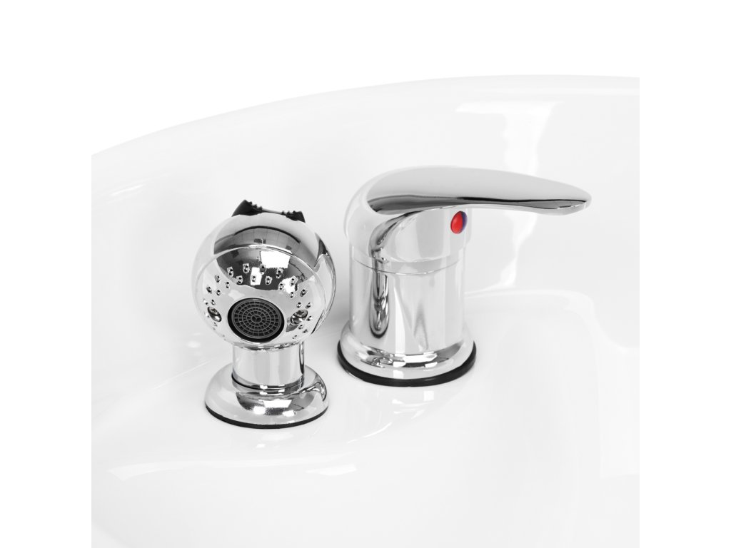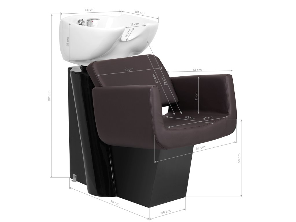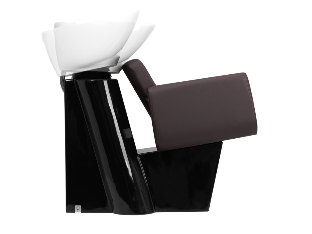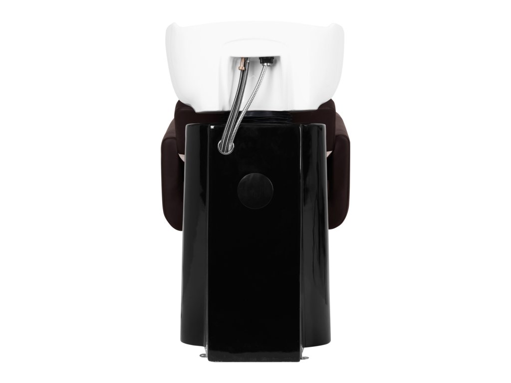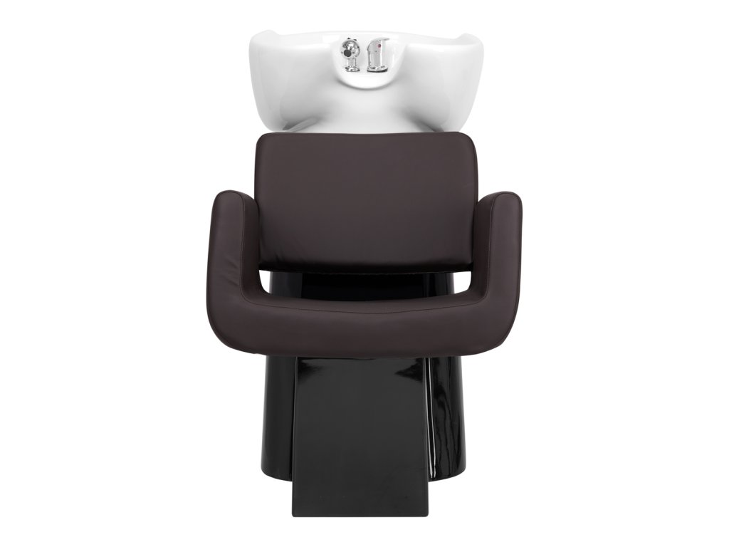 profesionálna kadernícka umývačka - stabilná, veľmi pohodlná, pevne skonštruovaná. moderný dizajn z nej robí krásny doplnok vybavenia moderného kaderníckeho salónu. sedadlo z kvalitnej hnedej ekokože. biela miska myki, s možnosťou nastavenia jej sklonu. čierna, hnedá a biela umývačka.
