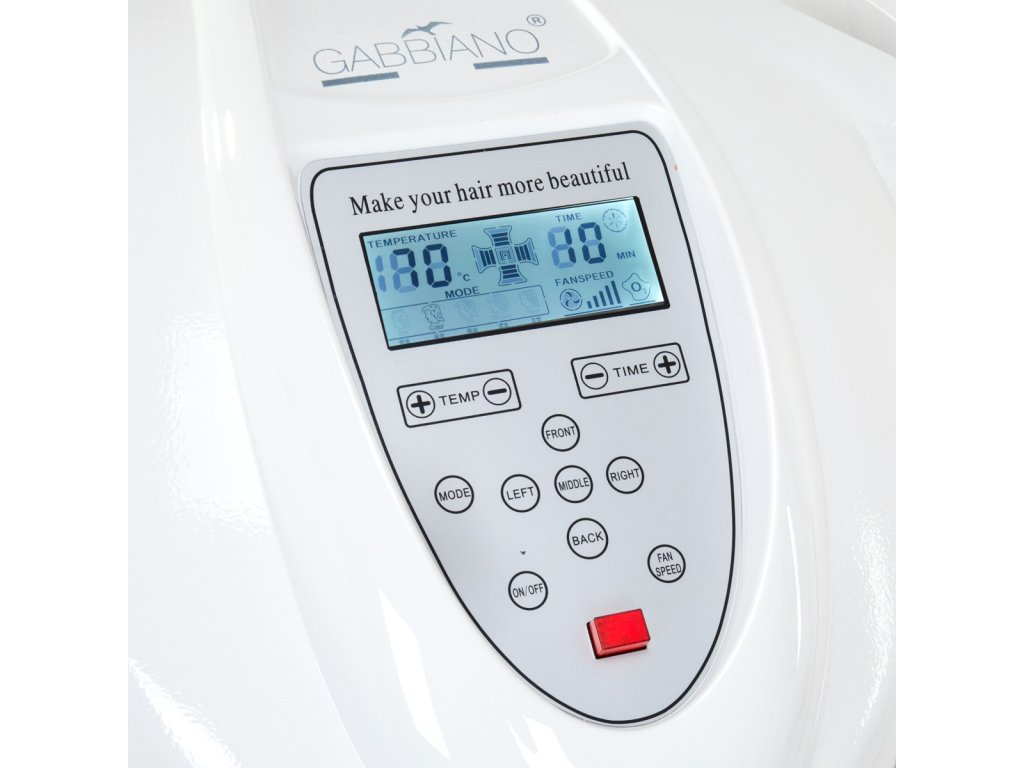 Elektronická regulácia parametrov uľahčuje prácu kaderníka. Zariadenie je vybavenéintuitívny ovládací panel s prehľadným LCD displejom, čo zaručuje jednoduchú obsluhu. Pomocou neho môžete efektívne prepínať medzi automatickými prevádzkovými režimami, nezávisle nastavovať výkon každého z piatich prúdov vzduchu, teplotu (v rozmedzí 50-80 °C) a trvanie ošetrenia (od 1 do 60 min).Výrazne zlepšuje výkonnosť rôznych liečebných postupov.
