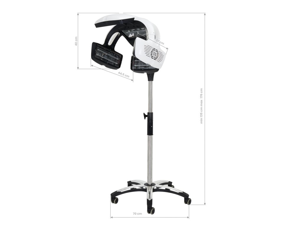 ProfesionálGabbiano Y-707 stojaca infrazóna je zariadenie potrebné pri vykonávaní ošetrení, ako je farbenie, rozjasňovanie, starostlivosť alebo sušenie, ako aj pri trvalom stylingu a iných službách, pri ktorých je užitočná vysoká teplota. Zariadenievýrazne skracuje trvanie liečby, čo umožňuje prijať väčší počet klientov pri zachovaní vysokej kvality služieb poskytovaných v salóne.