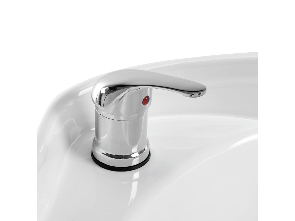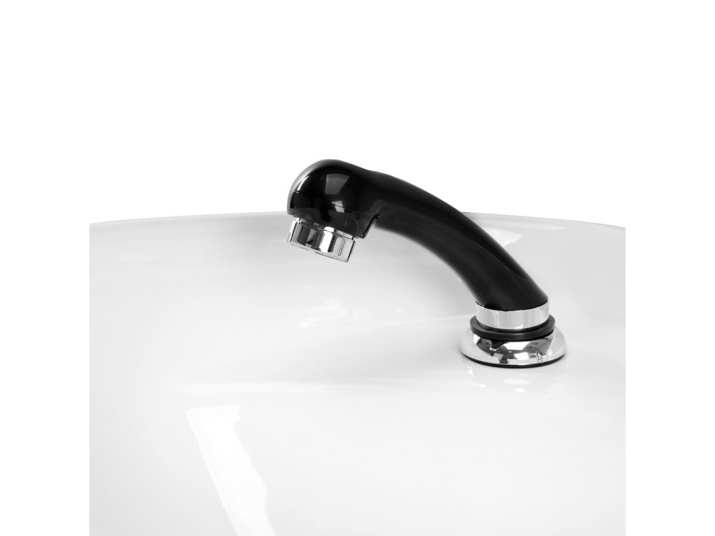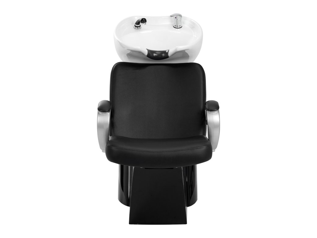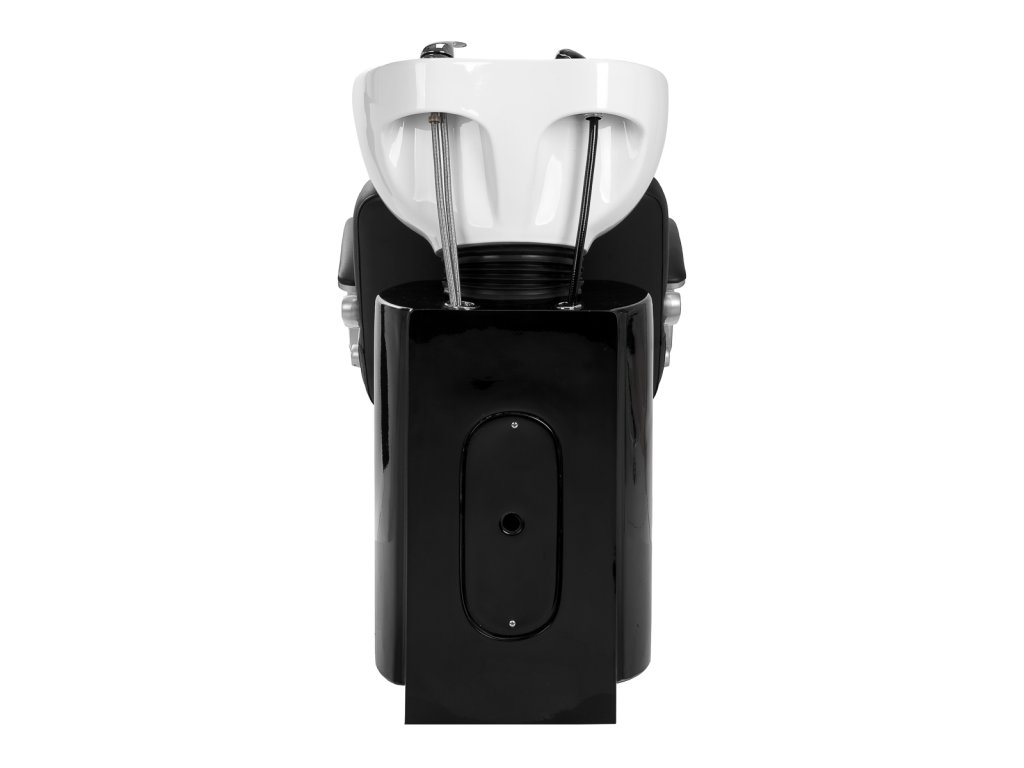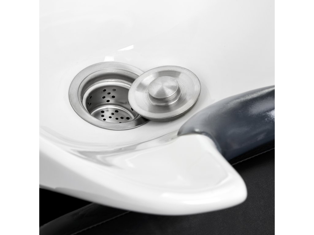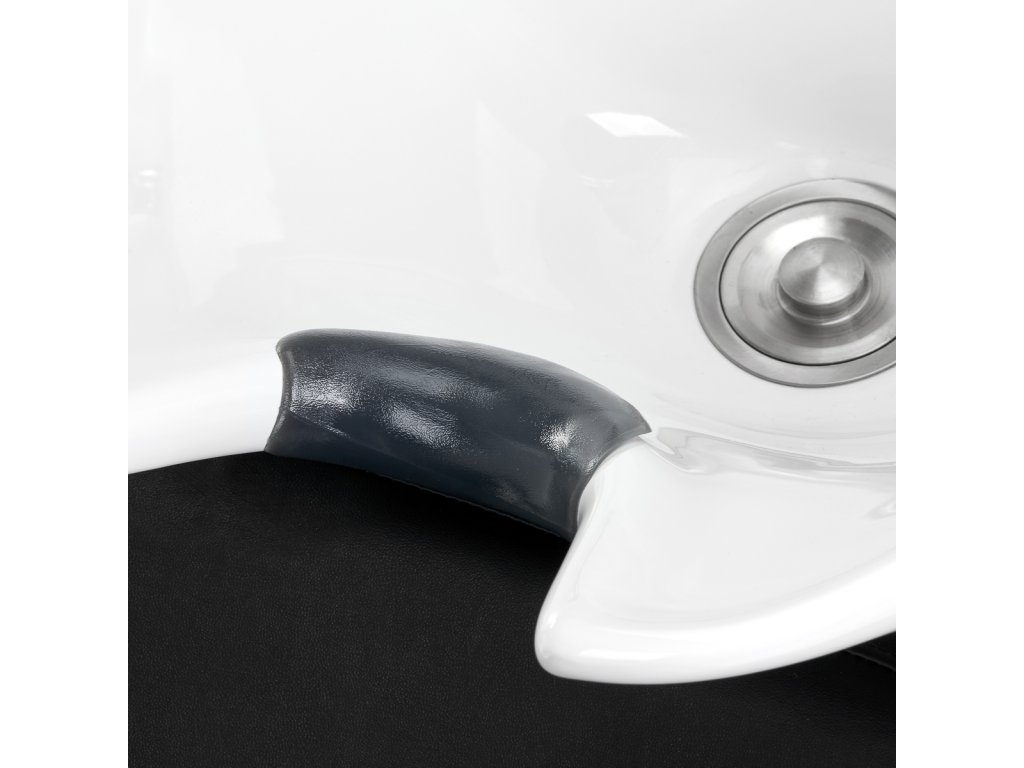 Vhodná hĺbka bielej keramickej misyzabraňuje nadmernému striekaniu vody a produkty používané počas liečby. Umožňuje pohodlné a efektívne vykonávanie širokej škály služieb. Pohyblivosť misy umožňuje ľahko nastaviť jej uhol sklonu podľa individuálnych potrieb. Vďaka použitému materiálu je umývadlotrvanlivé, odolné voči zmene farby a poškriabaniu a veľmi ľahko sa udržiavajú v čistote. Správne profilovaný golier poskytujeoptimálna podpora a pohodlie pri umývaní vlasov a pohodlný plastový kryt v odtieňoch čiernej farby spôsobuje, že klient nebude cítiť nepríjemnosť studeného keramického povrchu.