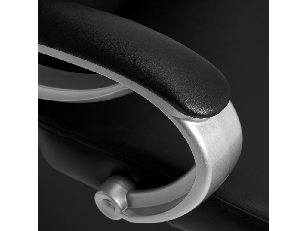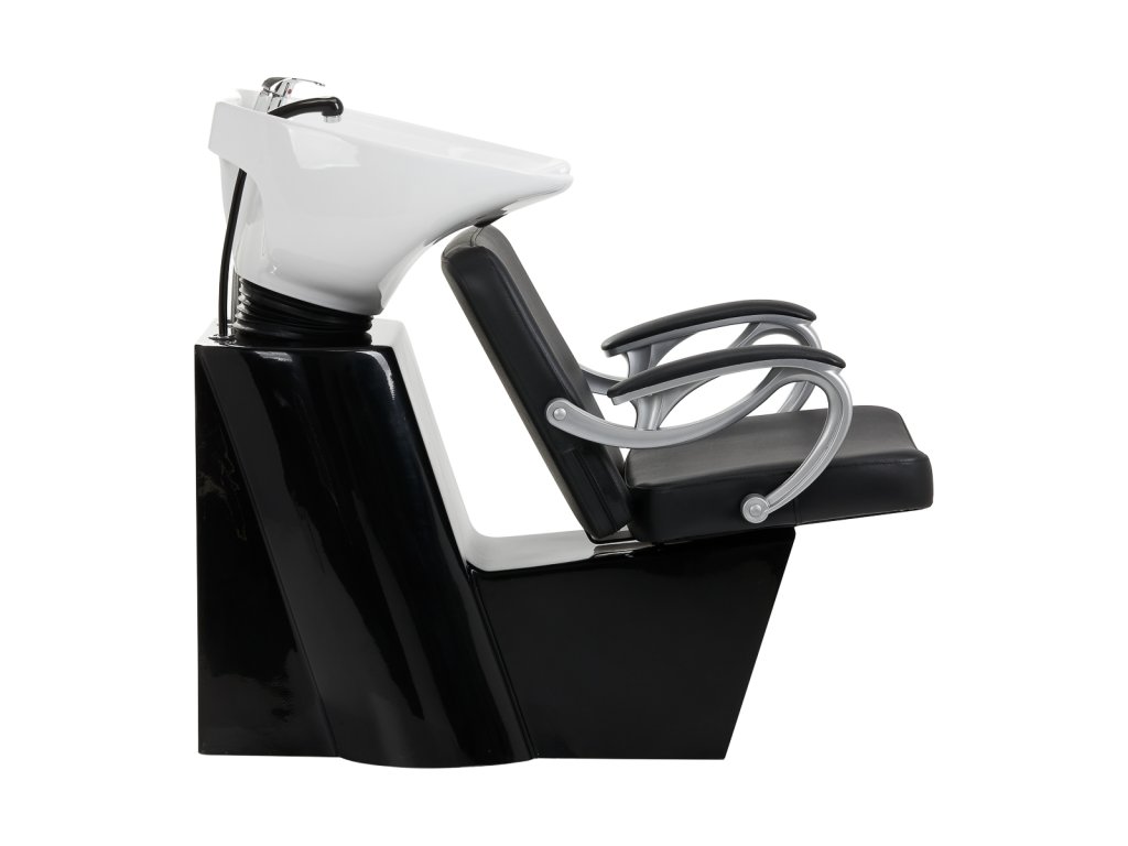 Správne profilovaná stolička vyplnená odolnou penouzaručuje vysoký komfort používania a zaujímavo zakrivené, čiastočne čalúnené podrúčky umožňujú správne polohovanie ramien klienta a sú vizuálne atraktívnym prvkom. Pohodlné operadloumožňuje zaujať správnu polohu a zabezpečuje oporu chrbta. Čierny poťah a ozdobné zlatom lakované kovové povrchy mu dodávajú nadčasovú eleganciu a navyšezaručuje dlhodobú životnosť a jednoduché čistenie. Pôvodný vzhľad kaderníckej umývacej jednotky dáva interiérujedinečný výraz. Súprava obsahuje kompletné príslušenstvo vrátane batérie, sprchovej hlavice a vyhradených hadíc na zabezpečeniekompletnú sadu pracovných nástrojov.