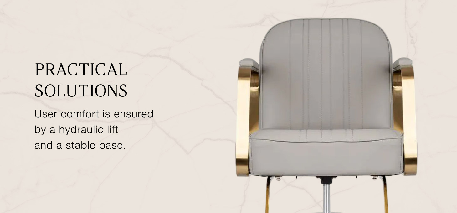 Mechanizmus úplného otáčania kresla je práca kaderníka efektívnejšia a pohodlnejšia. Pevné, okrúhlezákladňa zaručuje stabilitu počas používania. Leštený, hladký povrch dáva prvku elegantný vzhľad a ľahko sa udržiava v čistote. Pohodlné sedadlo vyplnené mäkkou penou zaručujevysoký komfort používania, a to aj počas mnohých hodín liečby. Čiastočne čalúnené, kovové podrúčky so zaujímavým tvarom umožňujúsprávna poloha ramien klienta - to znamená, že nezakrýva hlavu do ramien a nehrbí sa - čouľahčuje vykonávanie presných ošetrení, vrátane strihania vlasov.