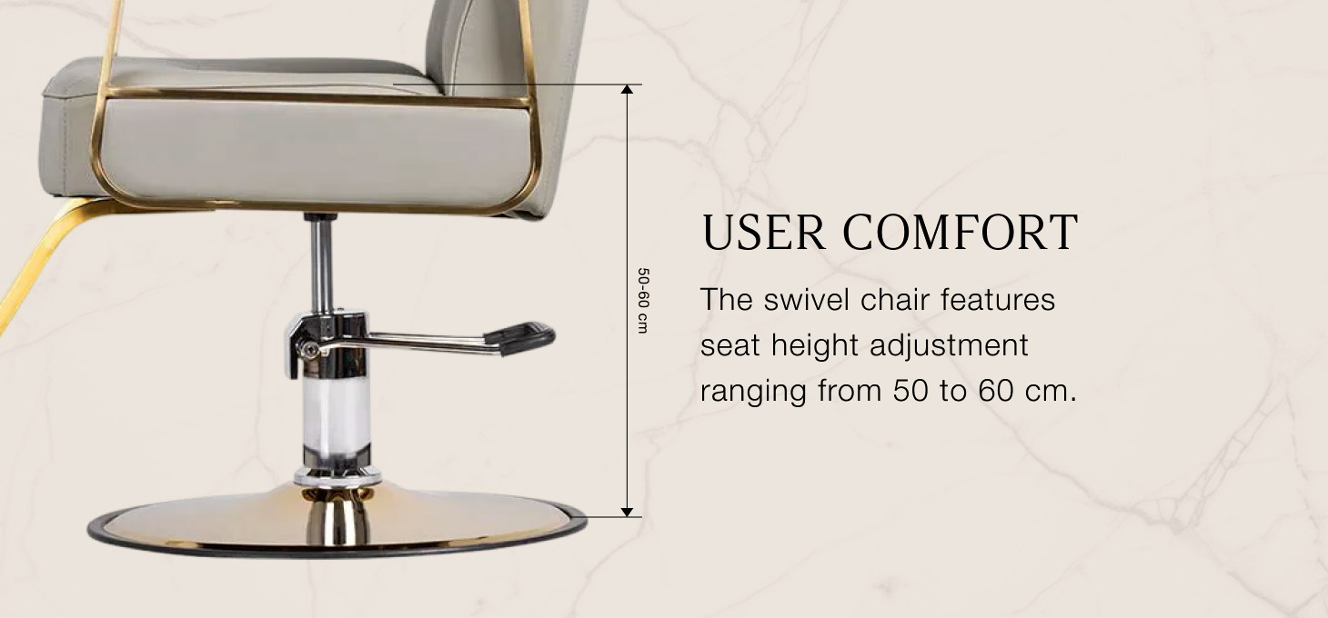 Odolný hydraulický výťah umožňuje nastaviť úroveň sedadlado 50-60 cm - aj keď klient sedí na stoličke.Uľahčuje efektívnu prácu tým, že umožňuje jednoduché nastavenie úrovne sedadla podľa výšky klienta aj kaderníka. Pohodlné operadlo umožňuje zaujať pohodlnú polohu,poskytuje vynikajúcu oporu chrbta, čo je dôležité najmä v prípade dlhých hodín liečby.Štýlová opierka na nohy určený pre tento model poskytuje stabilnú oporu pre nohy používateľa.