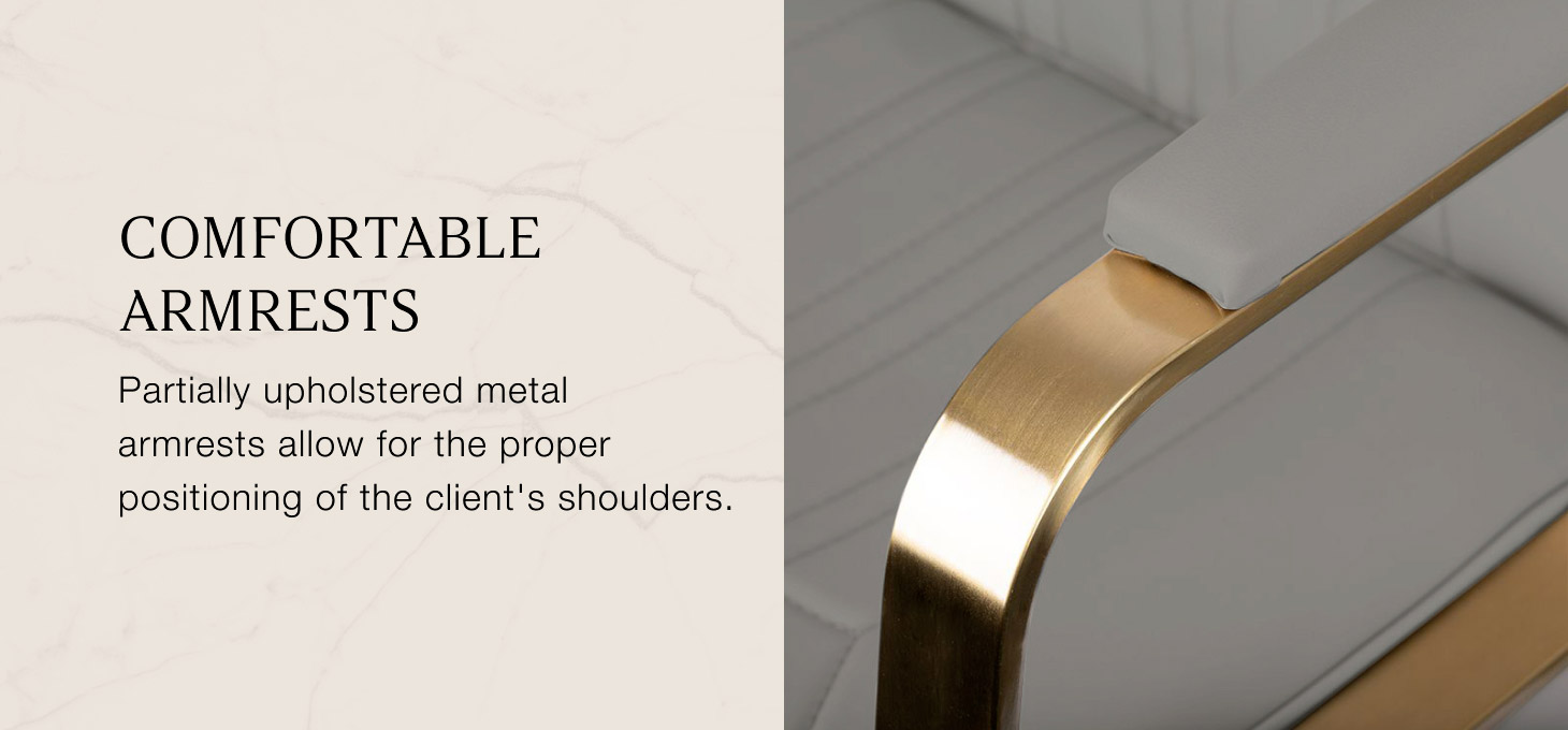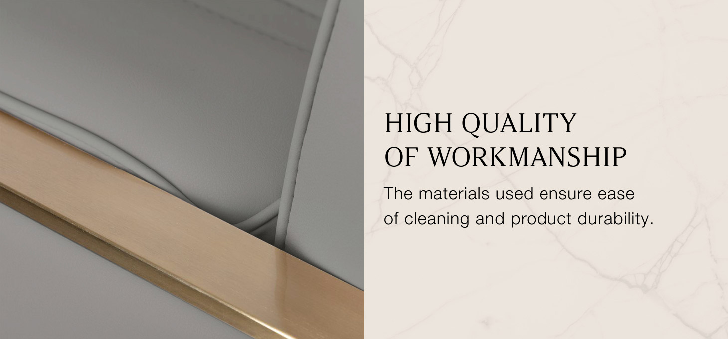 Polstrovanie z odolnej peny odolnej voči deformácii a čalúnenie zo syntetickej kože príjemnej na dotyk zaručujútrvanlivosť nábytku a jeho pohodlné používanie v priebehu rokov. Vďaka použitým materiálom je zariadenieodolné voči vlhkosti, trvanlivé a ľahko sa čistia. Poťah v béžových odtieňoch, estetické prešívanie a prvky v zlatých odtieňoch mu dodávajú jedinečný charakter. Vďaka modernému dizajnu toto zariadenie dokonale zapadá do atmosféry mnohých profesionálnych salónov a dodáva im jedinečný štýl.
