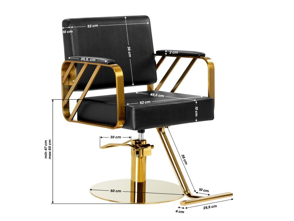 Pevná, plochá, kruhová základňazaručuje stabilitu počas používania. Hladký povrch so zrkadlovou úpravou uľahčuje udržiavanie prvku v čistote. Sedadlo s penovou výplňouzaručuje vysoký komfort používania a pohodlie aj počas mnohohodinových procedúr. Vybavenie kreslamechanizmus úplného otáčania zefektívňuje a spríjemňuje prácu kaderníka.Elegantná opierka na nohyurčený pre tento model poskytuje stabilnú oporu pre nohy používateľa.Čiastočne čalúnené opierky rúk sú umiestnené v správnej výške, čo umožňuje správnu polohu ramien klienta - to znamená, že nezakopáva hlavu do ramien ani sa nehrbí - jasne uľahčenie presného vykonávania ošetrení, vrátane strihania vlasov.