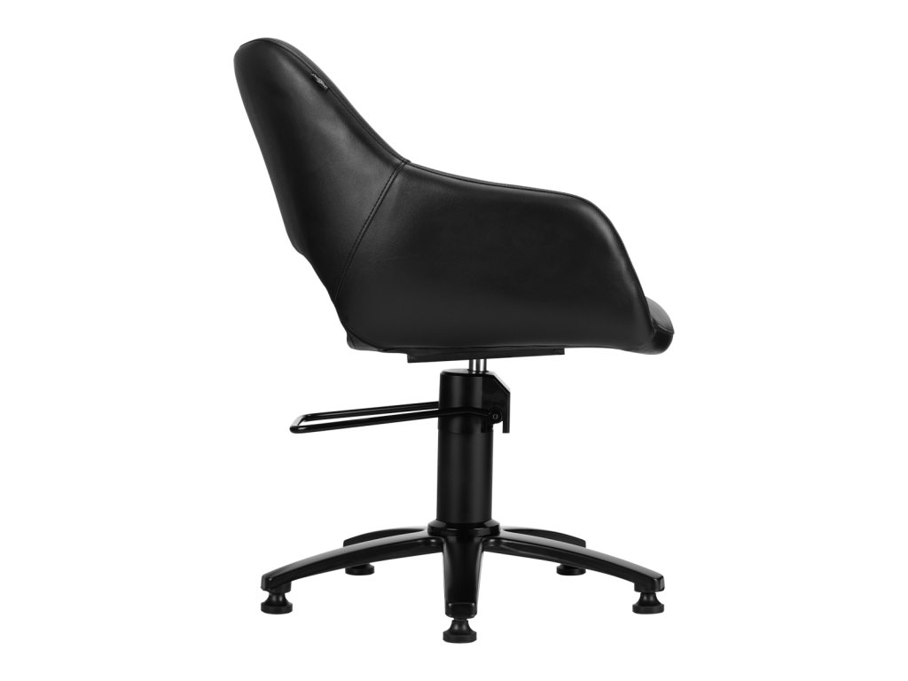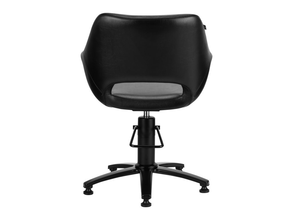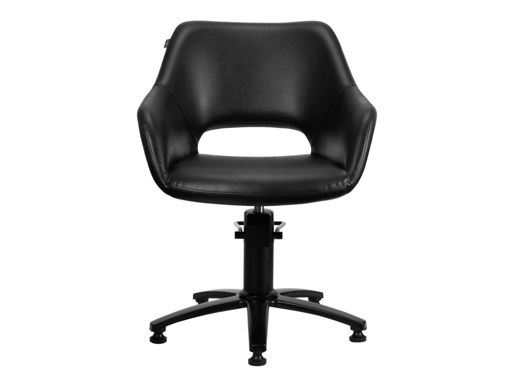 Moderné čierne kadernícke kreslo. Stojí na stabilnej päťhviezdičkovej základni. Sedadlo je potiahnuté kvalitnou ekokožou. Sedadlo je nastaviteľné hore a dole. Dobre profilované sedadlo zabezpečuje pohodlnú polohu pre klienta počas kaderníckych procedúr.