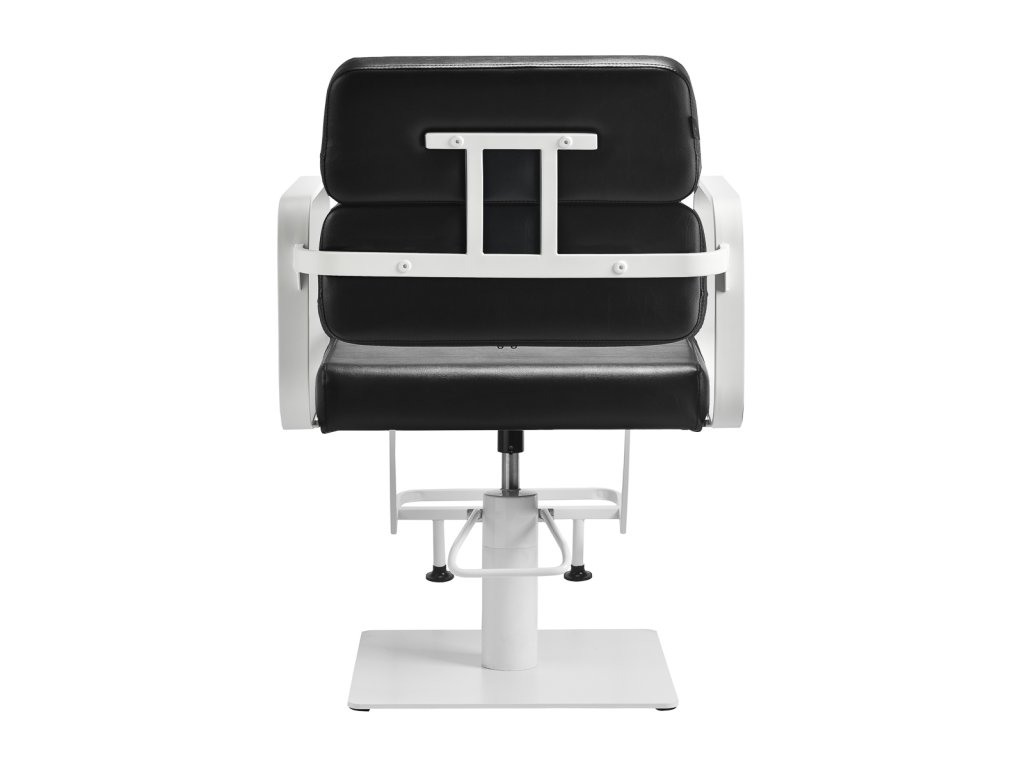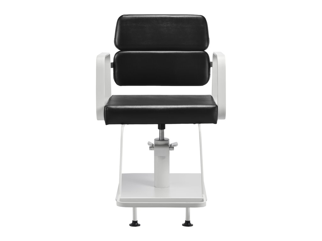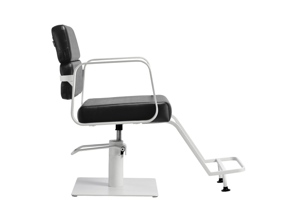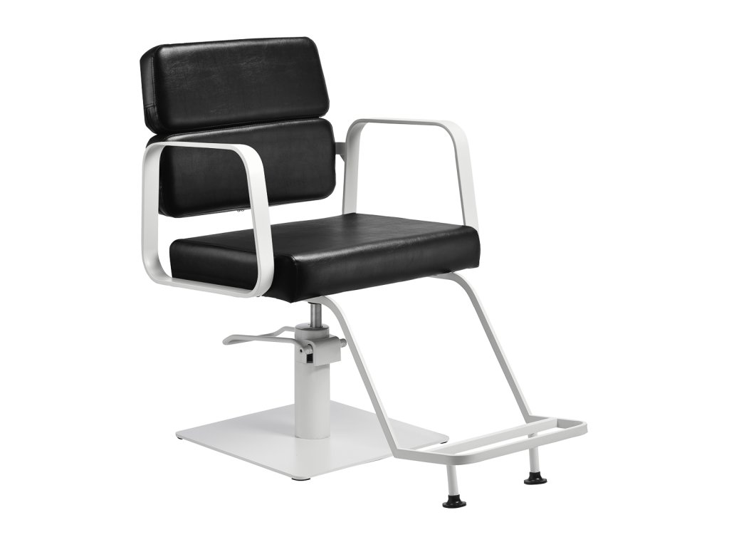 Mechanizmus úplného otáčania stoličky robí prácu kaderníkaefektívnejšie a pohodlnejšie. Pevná, plochá základňa štvorcového tvaruzaručuje stabilitu počas používania. Hladký povrch s matnou povrchovou úpravou dodáva prvku elegantný vzhľad a umožňuje ľahko sa udržiava v čistote. Pohodlné sedadlo s penovou výplňou zaručujevysoký komfort používania, a to aj počas mnohých hodín liečby. Geometrické kovové opierky rúk umožňujúsprávna poloha ramien klienta - to znamená, že nezakrýva hlavu do ramien a nehrbí sa - čouľahčuje presné ošetrenie, vrátane strihania vlasov. Štýlová opierka na nohy určená pre tento model poskytuje stabilnú oporu pre nohy používateľa.