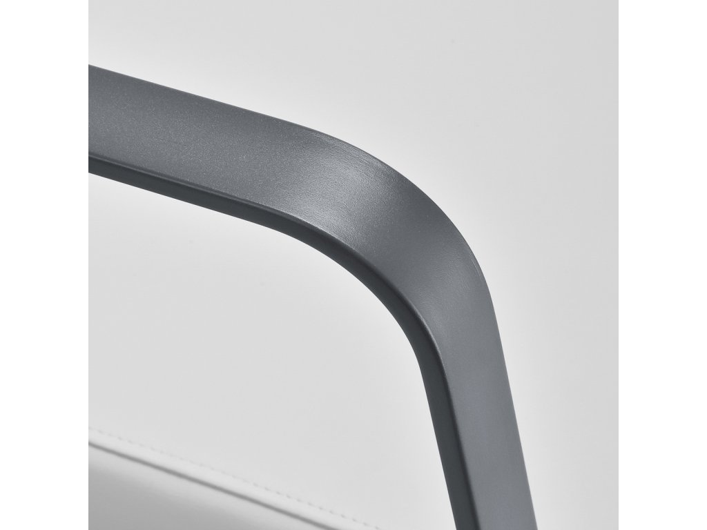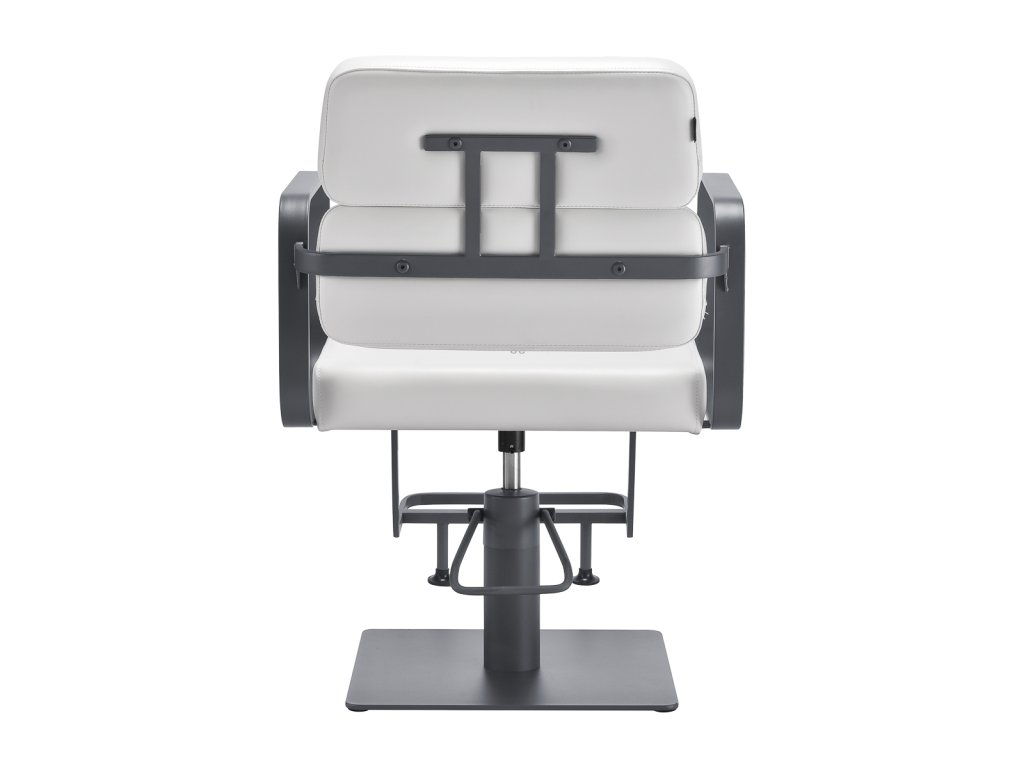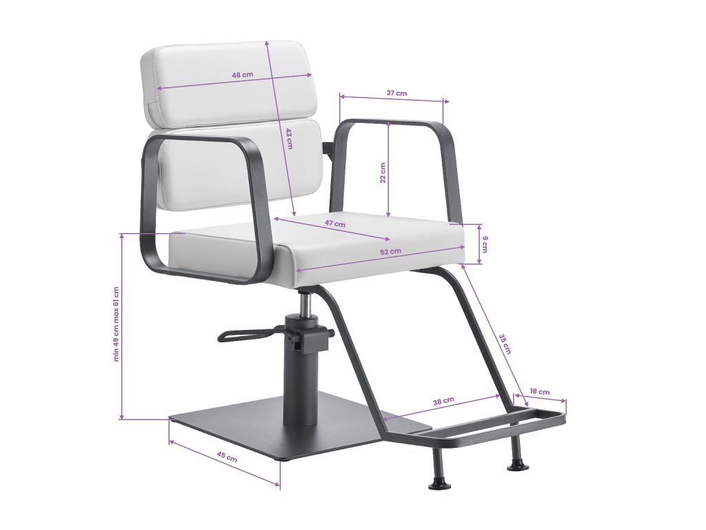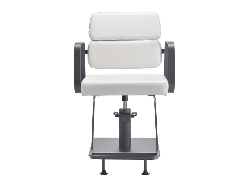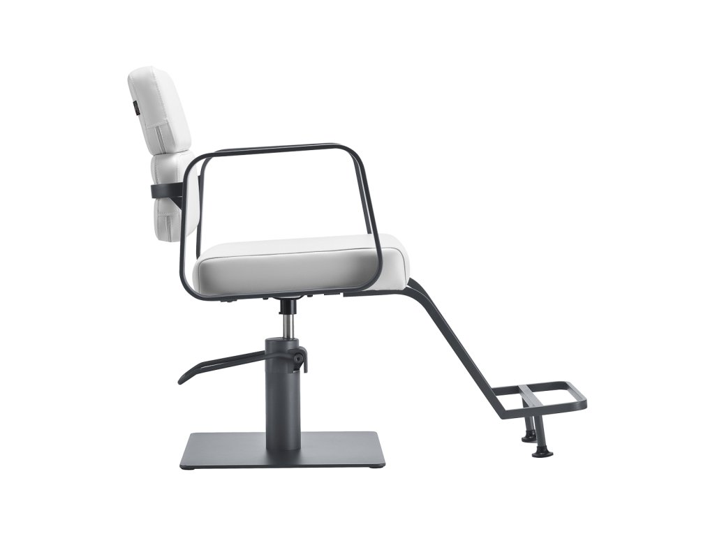 Mechanizmus úplného otáčania stoličky robí prácu kaderníkaefektívnejšie a pohodlnejšie. Pevná, plochá základňa štvorcového tvaruzaručuje stabilitu počas používania. Hladký povrch s matnou povrchovou úpravou dodáva prvku elegantný vzhľad a umožňuje ľahko sa udržiava v čistote. Pohodlné sedadlo s penovou výplňou zaručujevysoký komfort používania, a to aj počas mnohých hodín liečby. Geometrické kovové opierky rúk umožňujúsprávna poloha ramien klienta - to znamená, že nezakrýva hlavu do ramien a nehrbí sa - čouľahčuje presné ošetrenie, vrátane strihania vlasov. Štýlová opierka na nohy určená pre tento model poskytuje stabilnú oporu pre nohy používateľa.