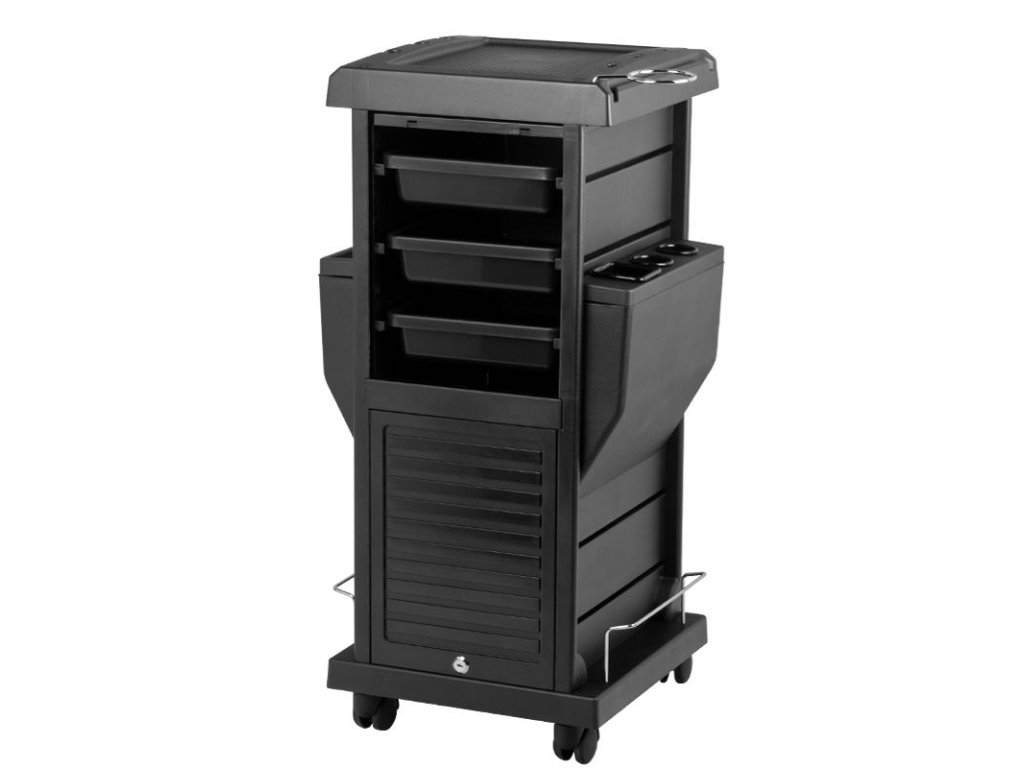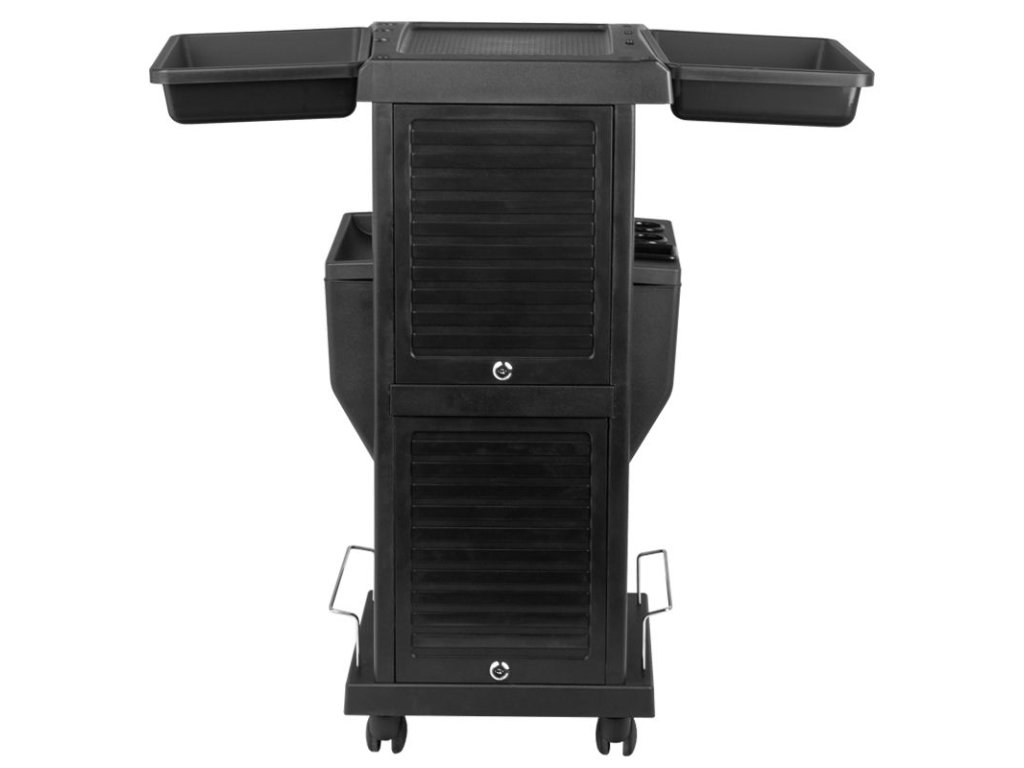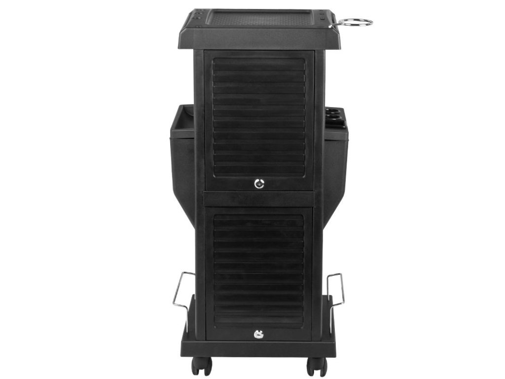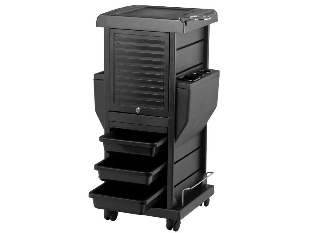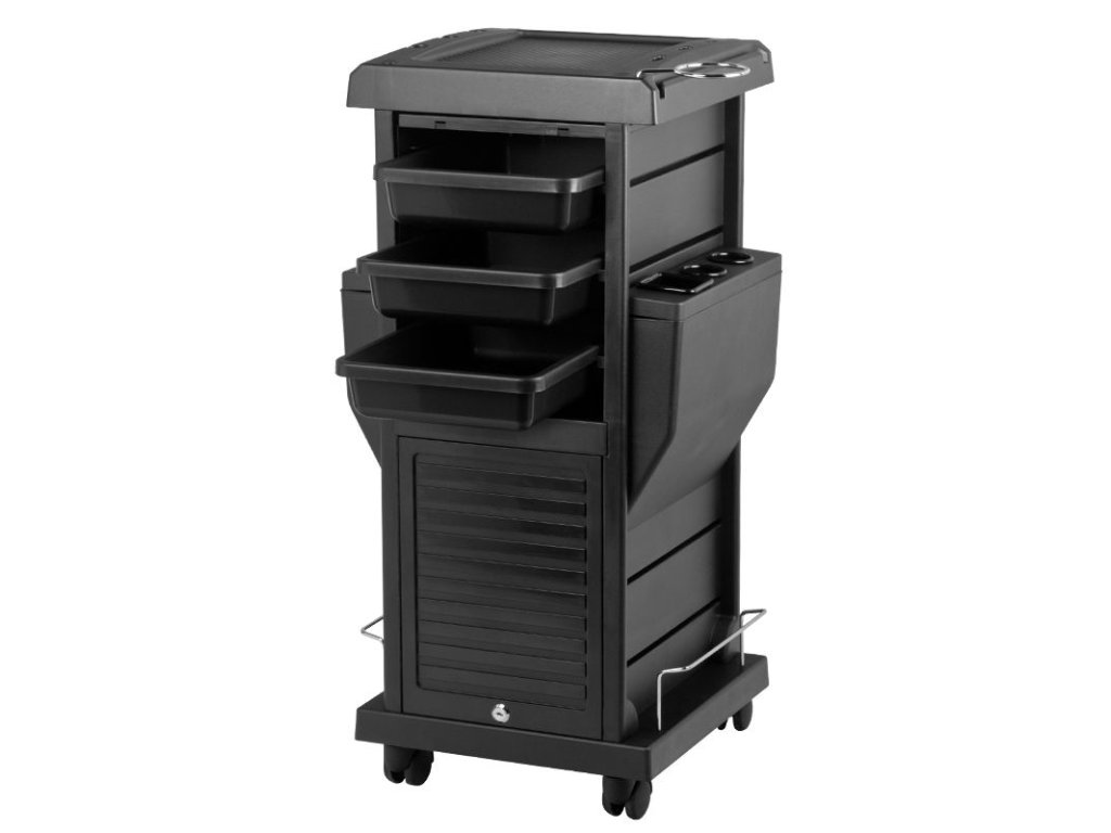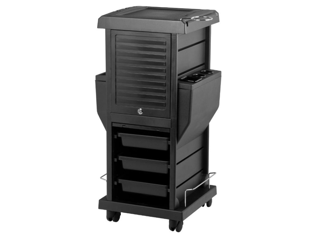 čierny kadernícky pomocník s 2 uzamykateľnými uzávermi na kľúč, 4 smetnými košmi a 15 priehradkami na kadernícky sortiment. stabilná konštrukcia zabezpečí dlhodobé používanie. stôl na kolieskach, vďaka ktorému budú nástroje vždy po ruke.