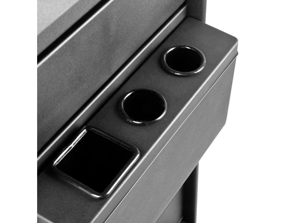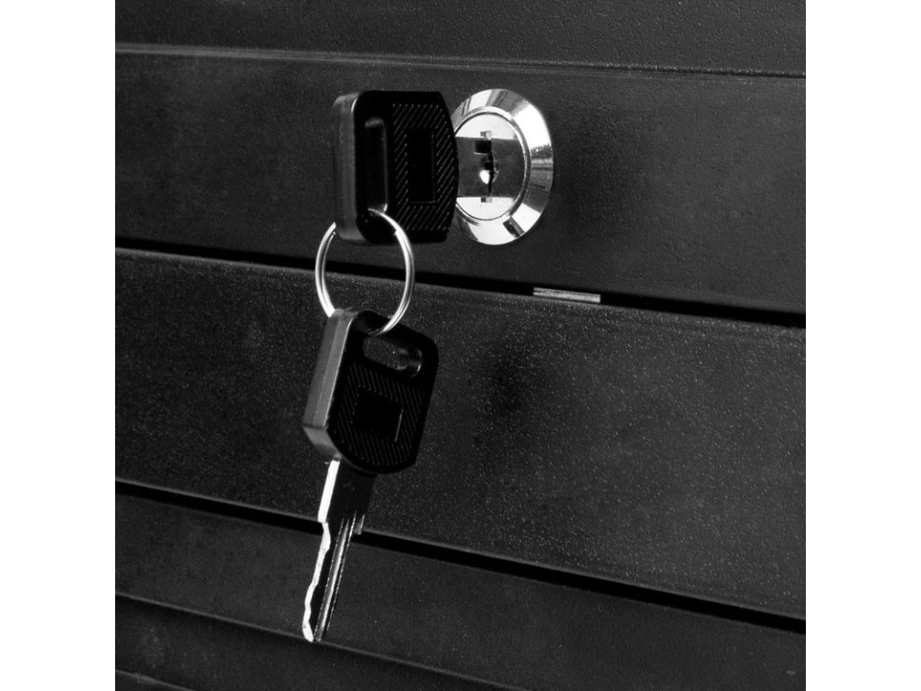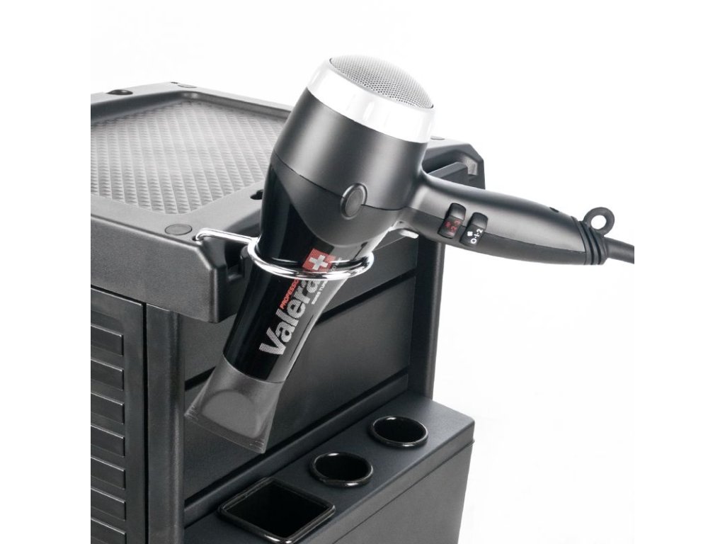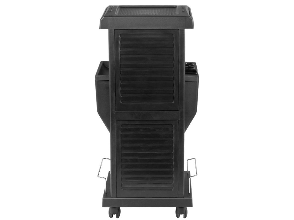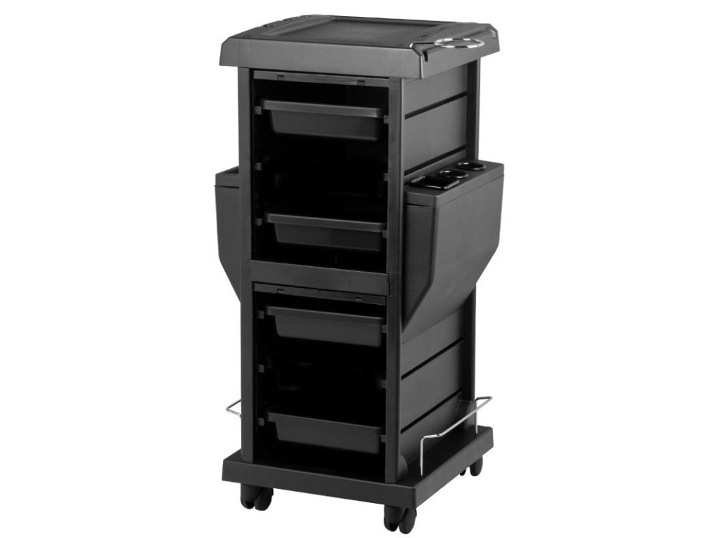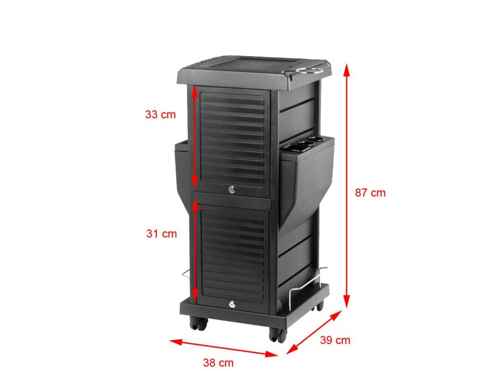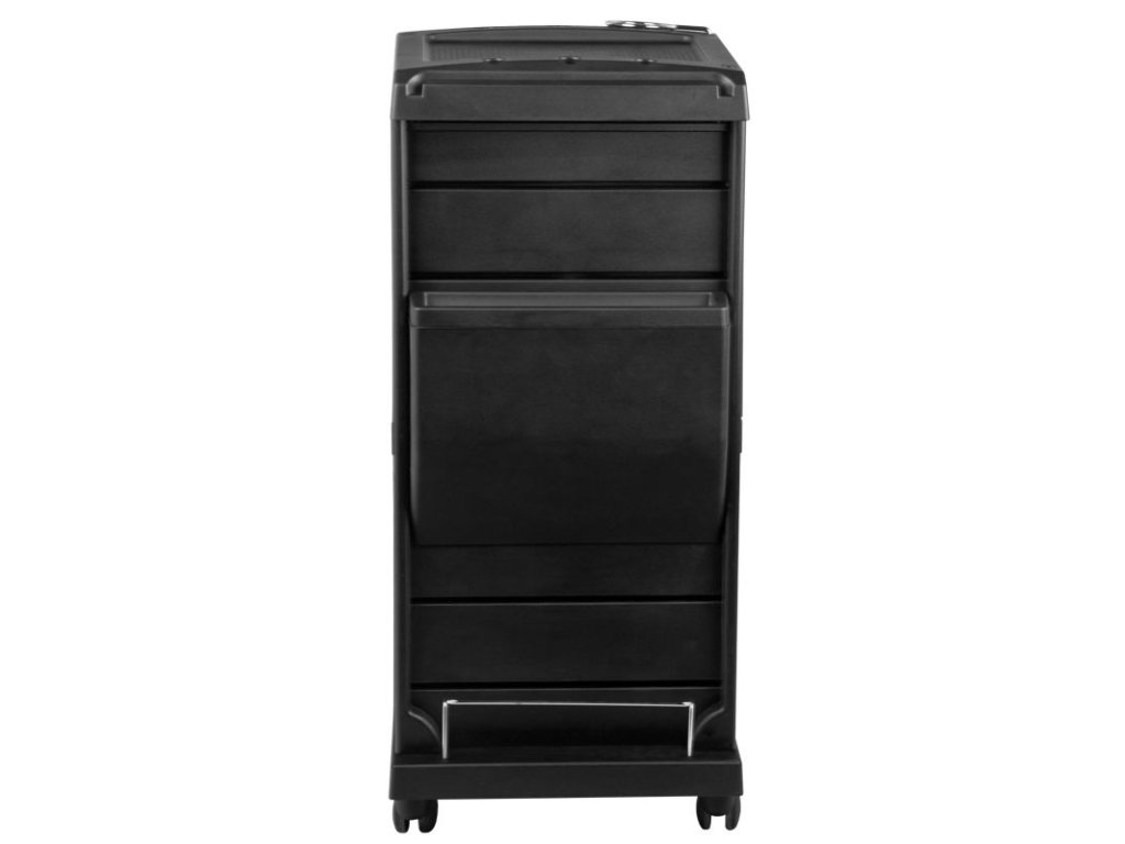 čierny kadernícky pomocník s 2 uzamykateľnými uzávermi na kľúč, 4 smetnými košmi a 15 priehradkami na kadernícky sortiment. stabilná konštrukcia zabezpečí dlhodobé používanie. stôl na kolieskach, vďaka ktorému budú nástroje vždy po ruke.