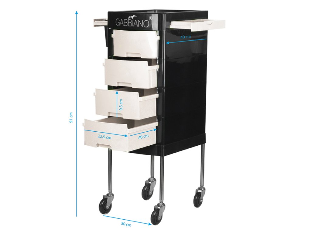 Kadernícky asistent Gabbiano je vysokokvalitný kus nábytku. Je vyrobený z odolného materiálu ABS s oceľovou rámovou konštrukciou, ktorá zaisťuje vysokú stabilitu a odolnosť. celok je namontovaný na veľmi odolných, guličkových, gumových kolieskach. dominantná čierna farba, zlomená s farbou zásuviek, dokonale zapadne do interiéru vašej obývačky!