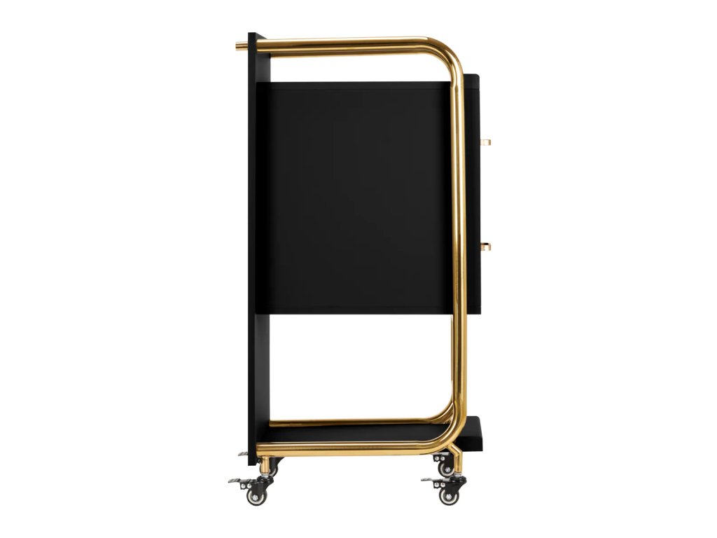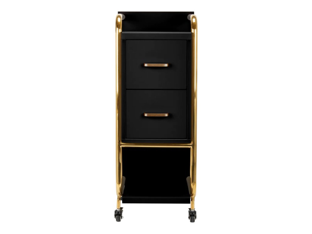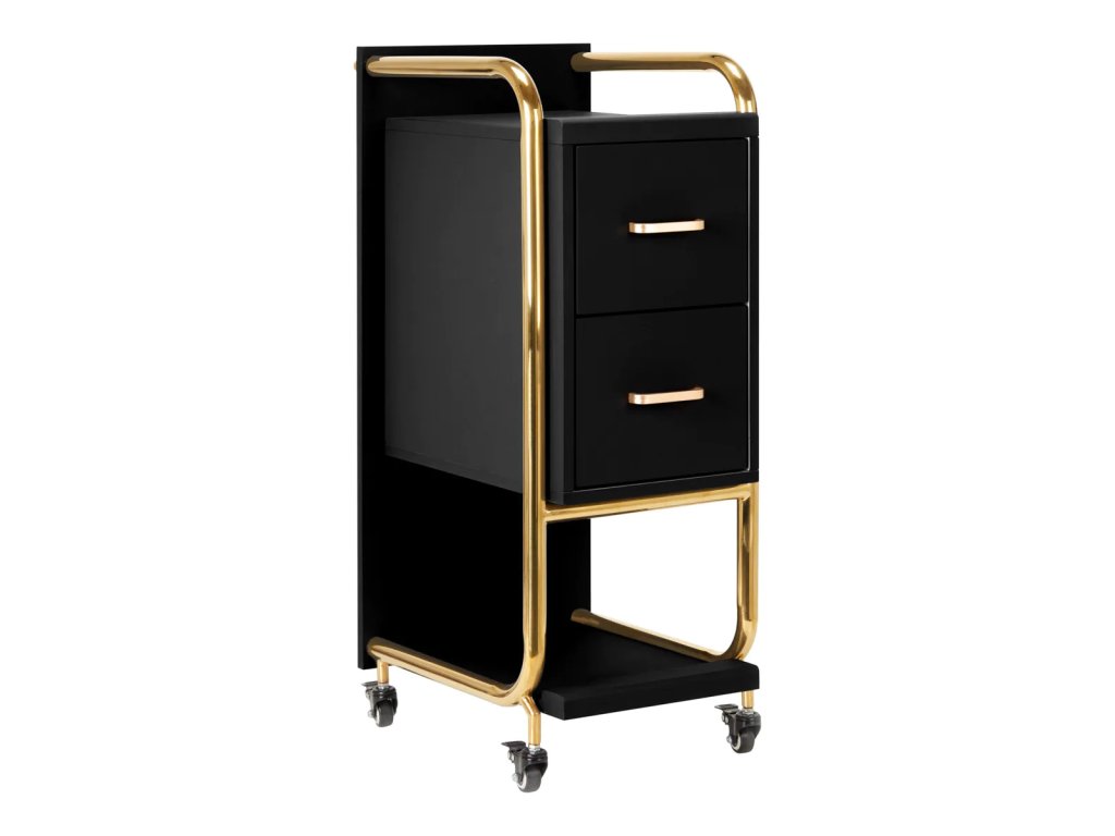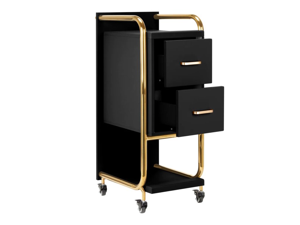 VysokokvalitnýGabbiano Sólo kadernícky asistent je elegantné zariadenie, ktoré výrazne zlepšuje prácu v kaderníckom salóne.Dve priestranné zásuvky a dve police rôznych veľkostí výrazne uľahčujú organizáciu výrobkov a potrebných nástrojov.Pogumované kolesá s brzdami zabezpečiť primeranú mobilitu, ktorá umožňuje umiestniť nábytok kdekoľvek v kaderníckom salóne. Elegantný dizajn - leštené kovové prvky v odtieňoch zlatej a stabilná konštrukcia z drevených dosiek v odtieňoch čiernej -dokonale zvýrazní charakter interiérov.