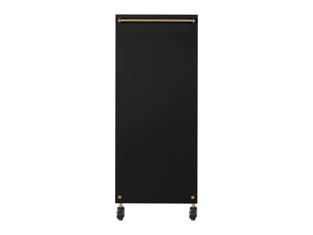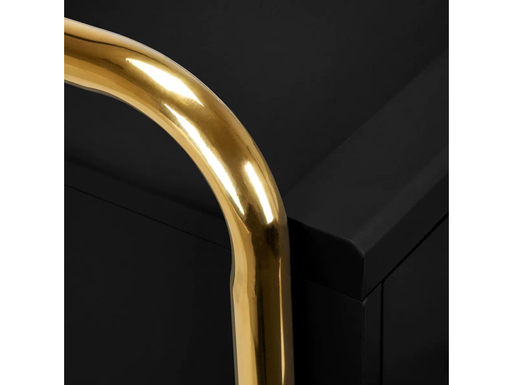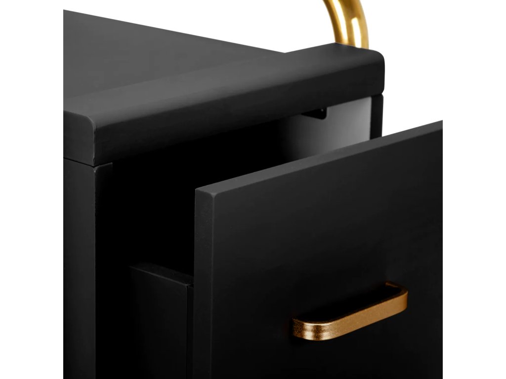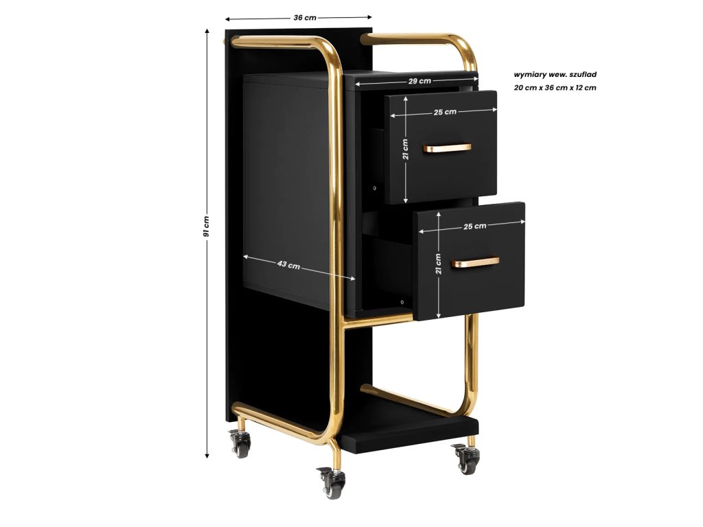 VysokokvalitnýGabbiano Sólo kadernícky asistent je elegantné zariadenie, ktoré výrazne zlepšuje prácu v kaderníckom salóne.Dve priestranné zásuvky a dve police rôznych veľkostí výrazne uľahčujú organizáciu výrobkov a potrebných nástrojov.Pogumované kolesá s brzdami zabezpečiť primeranú mobilitu, ktorá umožňuje umiestniť nábytok kdekoľvek v kaderníckom salóne. Elegantný dizajn - leštené kovové prvky v odtieňoch zlatej a stabilná konštrukcia z drevených dosiek v odtieňoch čiernej -dokonale zvýrazní charakter interiérov.