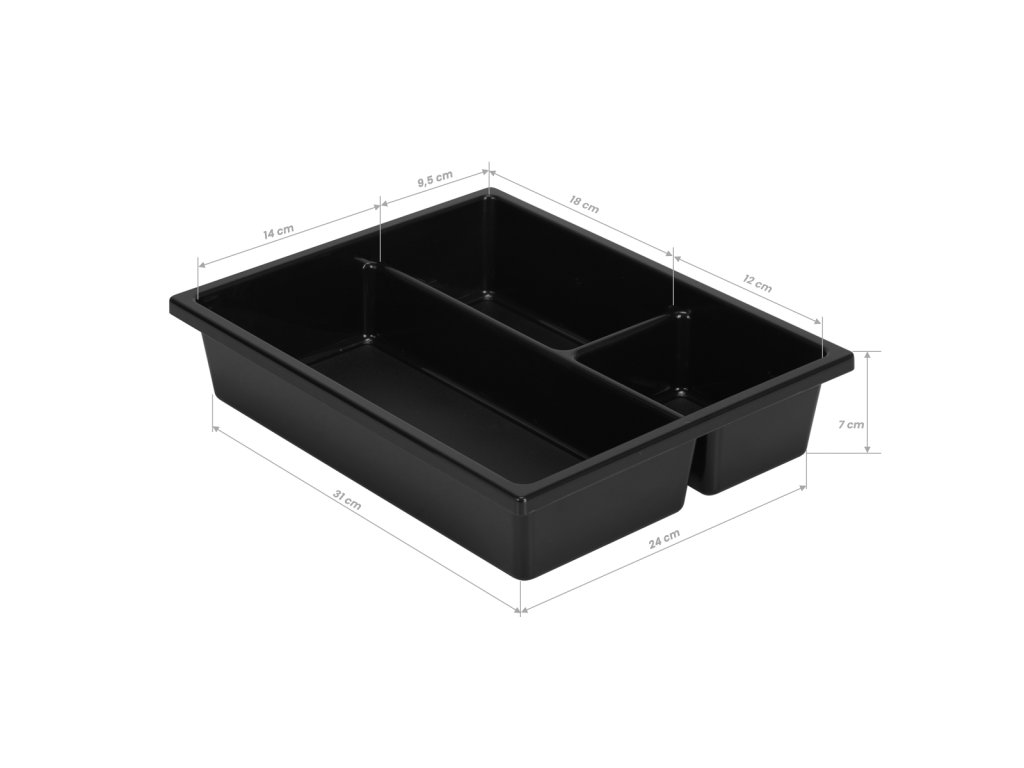 Priestranný organizér je vybavenýsada odkladacích zásobníkov ktoré pomôžuzabezpečiť poriadok na pracovisku, triedenie nástrojov potrebných na prácu kaderníka. Súprava obsahuješesť kontajnerov: dve bez priehradiek, dve s priehradkami a dve úzke a hlbšie.Ich usporiadanie v organizátore možno ľubovoľne meniť podľa vlastných potrieb a veľký výber rôznych typov zásuviek vám umožní rozdeliť náčinie podľa vlastného uváženia. Okrem toho,dve najhlbšie kyvety môžu byť umiestnené v rôznych výškach po stranách pomocného zariadenia, aby v nich uložené náčinie bolo vždy na správnej úrovni. V tomto modeli, zásuvky sa vysúvajú v oboch smeroch, čo je výrazné zlepšenie a uľahčuje prístup k produktom a nástrojom kedykoľvek.