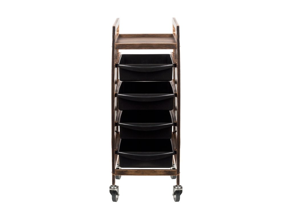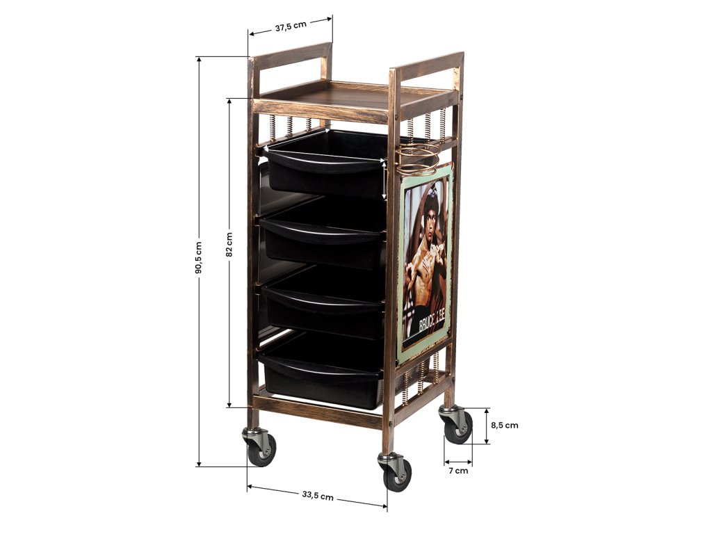 obojstranný kadernícky pomocník v starozlatej farbe, so 4 smetnými nádobami a držiakmi na kadernícke potreby. stabilná konštrukcia zabezpečí dlhodobé používanie. stôl je osadený na gumových kolieskach, vďaka ktorým budú nástroje vždy po ruke.