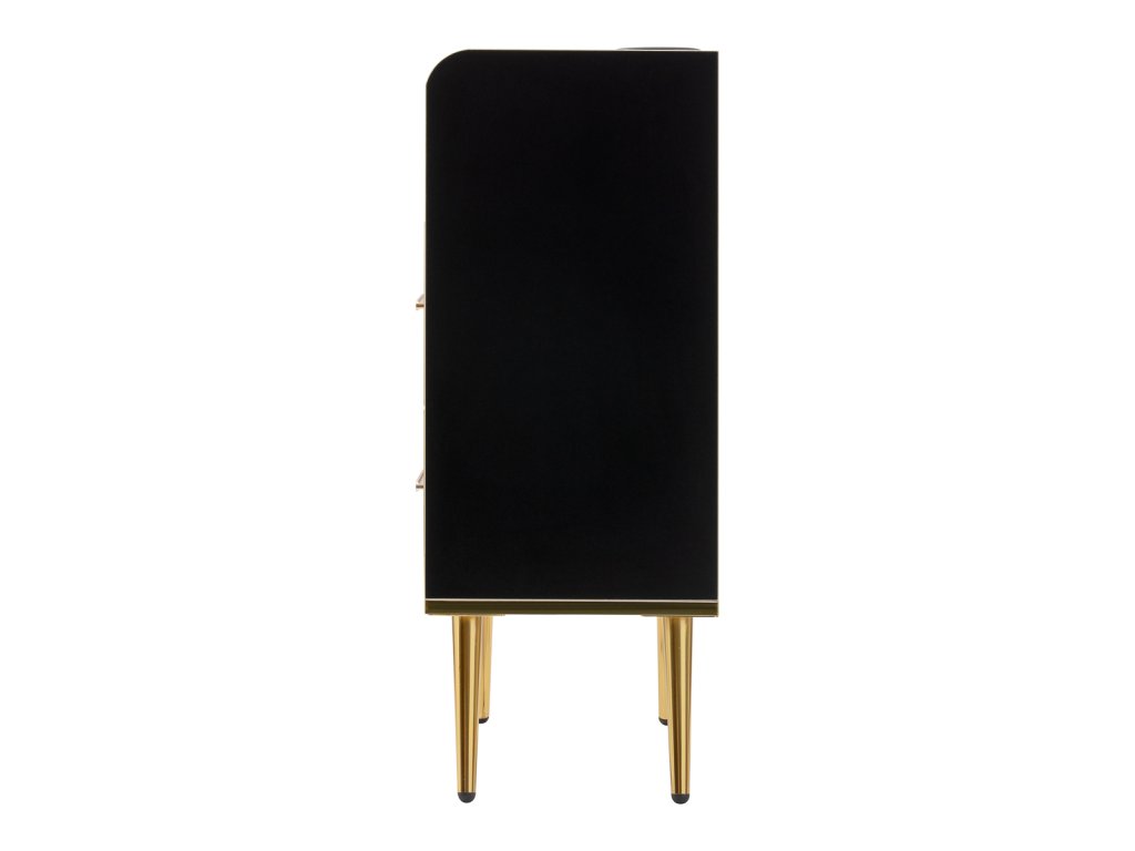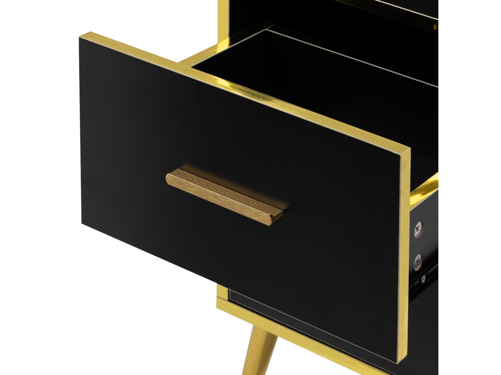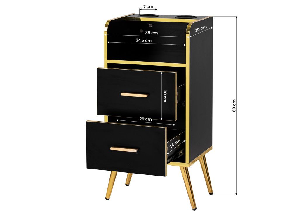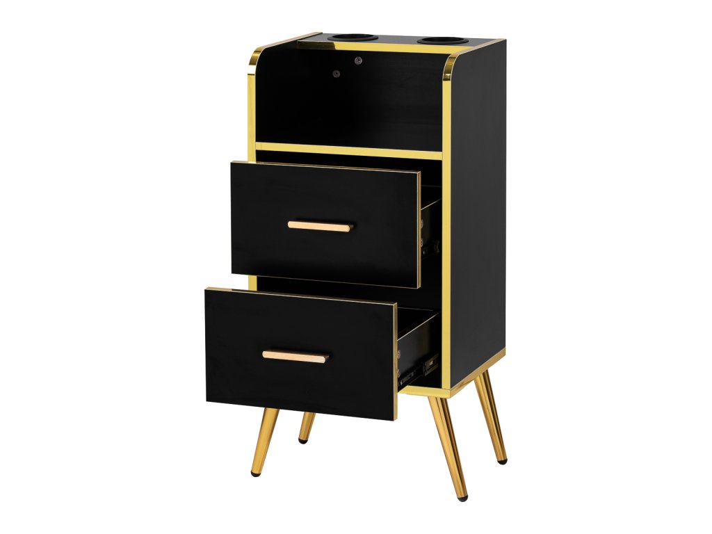 Stránkamoderný čierny dizajn s matným povrchom robí z pomocníkapútač očí a dokonale sa hodí do elegantných, profesionálnych interiérov.Leštené kovové prvky v odtieňoch zlatej farby a konštrukcia z masívneho dreva v odtieňoch čiernej farby zvýrazňujú eleganciu interiéru. Zlaté nohy nielenže dodávajú štýl, ale ajuľahčujú udržiavanie čistoty pod jednotkou, ktorá je nevyhnutná v každom profesionálnom salóne.