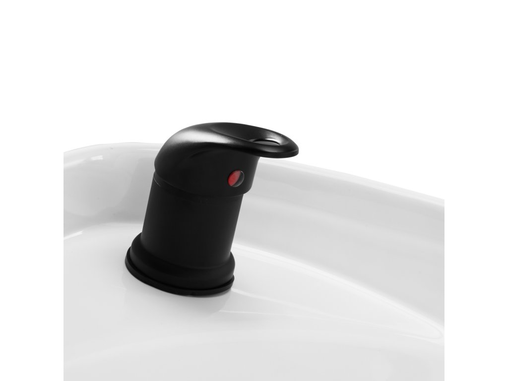 Primeraná hĺbka bielej keramickej misy umývadlazabraňuje nadmernému striekaniu vody alebo produktov používaných počas ošetrenia. To umožňujepre pohodlný a efektívny výkon širokej škály služieb. Uhol misky sa dá nastaviť, čo uľahčujeprispôsobiť sa individuálnym potrebám. Vďaka vysokej kvalite použitých materiálov je umývadlotrvanlivé, odolné voči zmene farby a poškriabaniu a veľmi ľahko sa čistia. Správne profilovaný golier a naklonené operadlo poskytujú podporu a pohodlie pri umývaní vlasov a vďakapohodlné čierne plastové prekrytie, zákazník nebude pociťovať nepríjemný chladný keramický povrch.