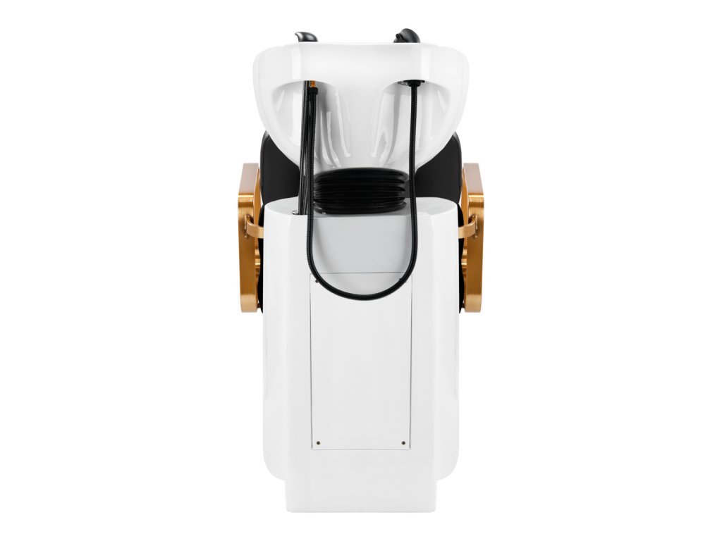 Profilovaná stoličkaposkytuje primeranú bedrovú oporu a tým aj vysoký komfort používania. Kovové podrúčky v odtieňoch zlatej farby s geometrickým tvarom umožňujúsprávna poloha ramien zákazníka. Výplň z odolnej peny odolnej voči deformácii a čalúnenie z na dotyk príjemnej syntetickej kože v odtieňoch čiernej farby zabezpečujú odolnosť nábytku, jednoduché čistenie a pohodlné používanie po dlhú dobu. Originálny, elegantný vzhľad umývačky vlasov dodáva interiéru jedinečný výraz. Súprava obsahujekompletné príslušenstvo v čiernych odtieňoch, vrátane batérie, sprchovej hlavice a špeciálnych hadíc naposkytnúť kompletnú sadu pracovných nástrojov.